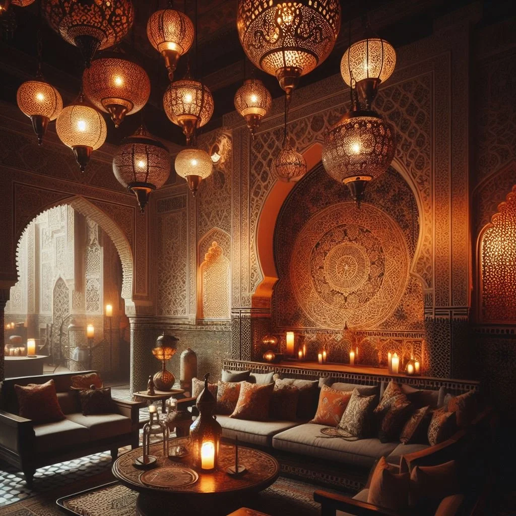 Create an enchanting ambiance with mood lighting such as lanterns, sconces, and candle holders inspired by Moroccan design. Soft, diffused lighting adds warmth and intimacy to your space, evoking the magical atmosphere of Moroccan riads. This soft, diffused lighting not only illuminates your space but also casts a warm and inviting glow, creating an ambiance that is both intimate and mesmerizing. Imagine the flickering flames of candles dancing within ornate lanterns, casting intricate shadows that dance across the walls of your living room or courtyard. Meanwhile, intricately designed sconces adorn your hallways, bathing them in a soft, golden hue reminiscent of the magical atmosphere found within traditional Moroccan riads. As the gentle light envelops your home, it creates a sense of serenity and enchantment, inviting you to embark on a journey of relaxation and discovery within the comforting embrace of Moroccan-inspired design.