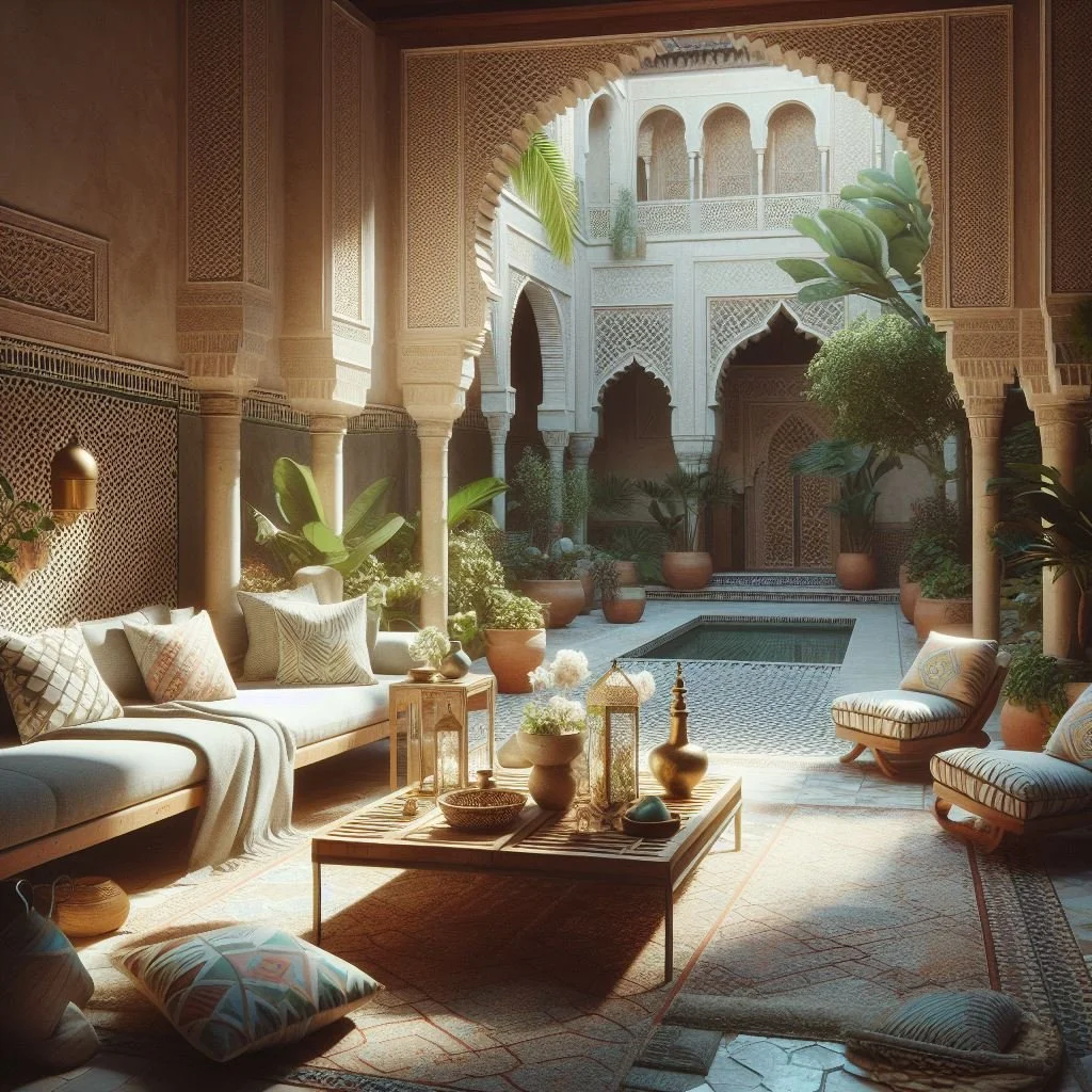 Transport yourself to an oasis of tranquility by transforming your outdoor space into a captivating Moroccan-inspired courtyard. Lush greenery, such as palm trees, vibrant flowers, and cascading vines, creates a verdant backdrop that envelops the senses in natural beauty. Cozy seating areas adorned with plush cushions and ornate textiles invite relaxation and conversation, while tranquil water features, such as fountains or reflecting pools, add a soothing ambiance to the atmosphere. Whether you're enjoying a leisurely afternoon tea or unwinding under the starlit sky, your Moroccan courtyard becomes a sanctuary of peace and serenity, offering respite from the chaos of the outside world and immersing you in the timeless allure of Moroccan hospitality.