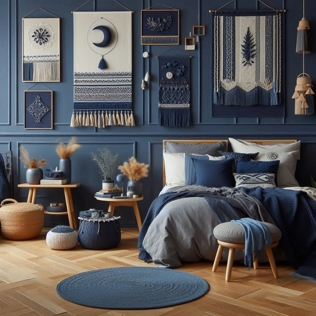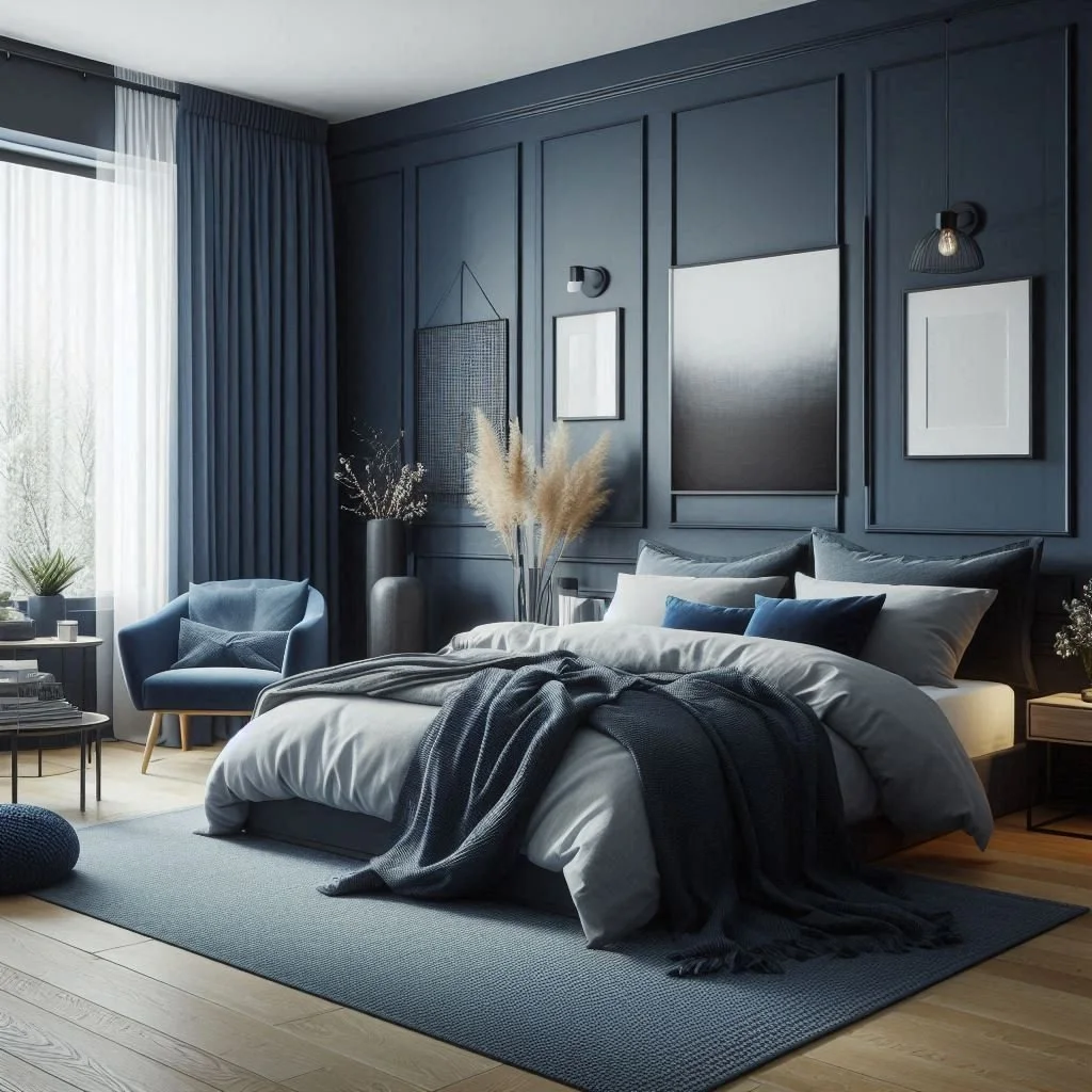 Layering textiles is a great way to enhance the beauty of a navy accent wall and add depth to your bedroom design. Velvet pillows in rich, luxurious tones or chunky knit throws bring a tactile element that contrasts beautifully with the deep blue wall. These cozy layers create an inviting and comfortable atmosphere, perfect for relaxation. To further elevate the space, add a tufted headboard in a contrasting shade, such as light gray or soft beige. The texture and color contrast of the headboard will add extra dimension to the room, balancing the boldness of the navy wall while providing a focal point for the bed. This combination of layered textiles and a contrasting headboard creates a sophisticated, cozy, and visually appealing bedroom retreat.