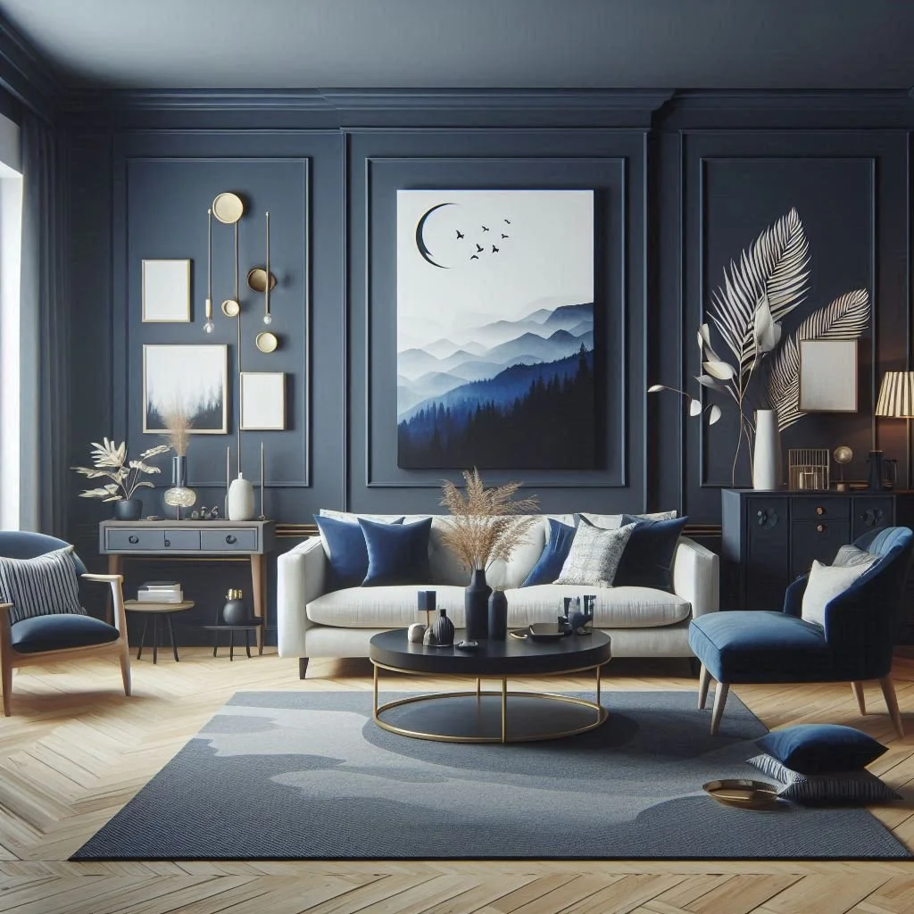 A navy blue accent wall in the living room creates a sophisticated and bold backdrop that enhances the overall mood of the space. This deep, rich color adds depth and elegance, making it a striking feature in the room. To balance the boldness of the navy, pair it with neutral furniture such as beige or cream sofas. These light tones create a harmonious contrast, allowing the accent wall to stand out without overwhelming the space. For an added touch of modern luxury, incorporate metallic elements like gold or brass lamps. The shine of these metallic accents adds warmth and sophistication, elevating the room’s design. Together, the navy blue, neutral furniture, and metallic details create a chic, inviting living room with timeless appeal.