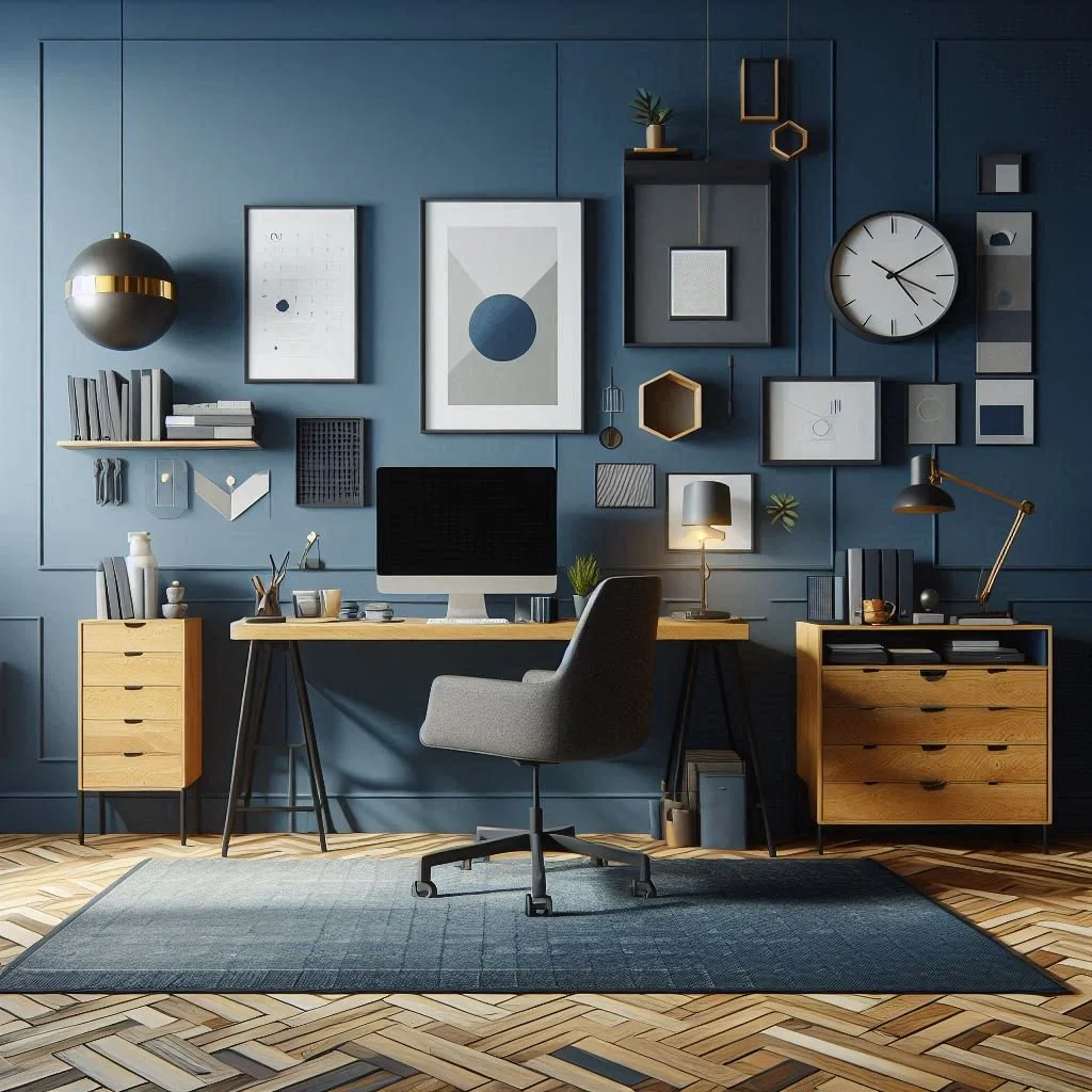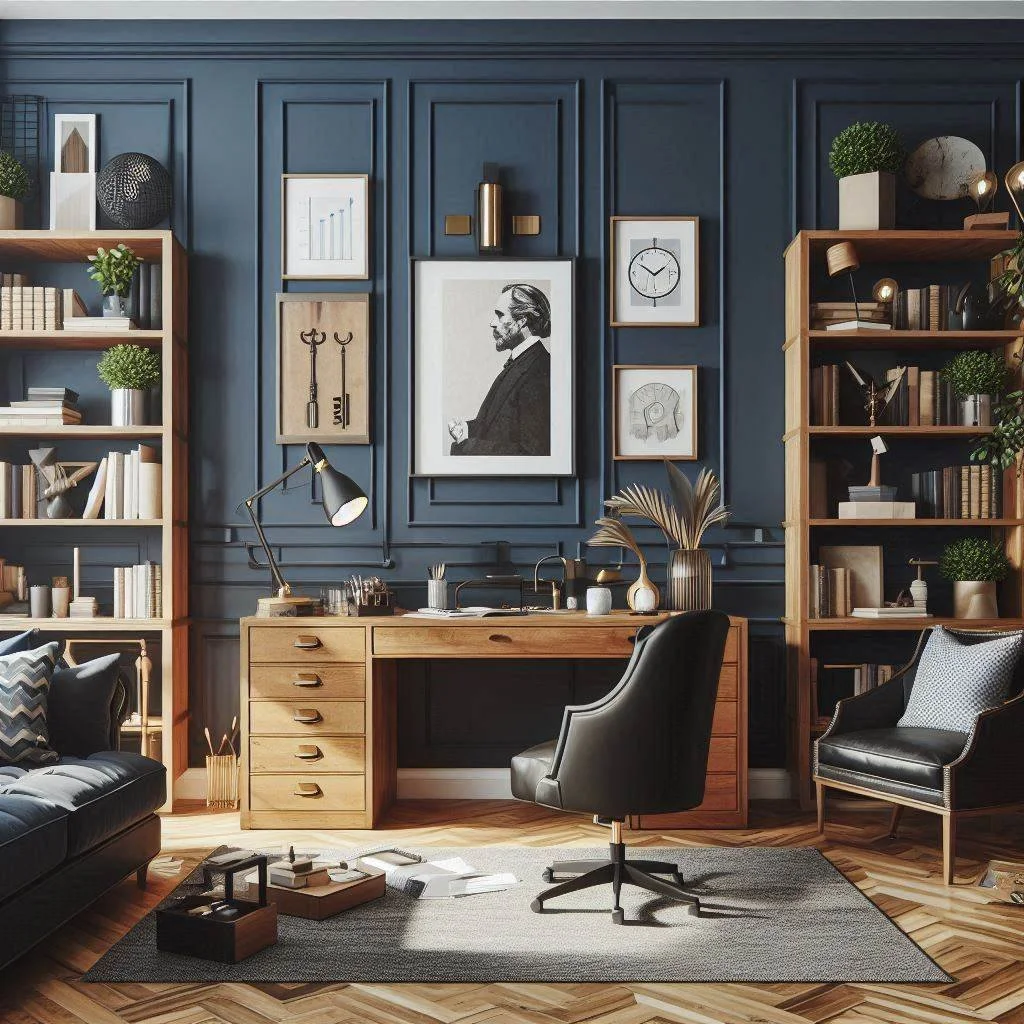 A navy blue wall in your home office creates a focused and productive environment, making it an ideal choice for a workspace. The deep, calming hue helps reduce distractions and promotes concentration, allowing you to stay engaged with your tasks. To balance the intensity of the navy, pair it with sleek white or black furniture for a modern, streamlined look. The contrast between the dark walls and the lighter furniture creates a clean, professional aesthetic. For added visual interest, incorporate a bold desk lamp with a unique design, such as a metallic or geometric style, to bring in a touch of contrast and functionality. This combination of navy, minimalist furniture, and a striking lamp creates a stylish and efficient home office that promotes productivity and focus.