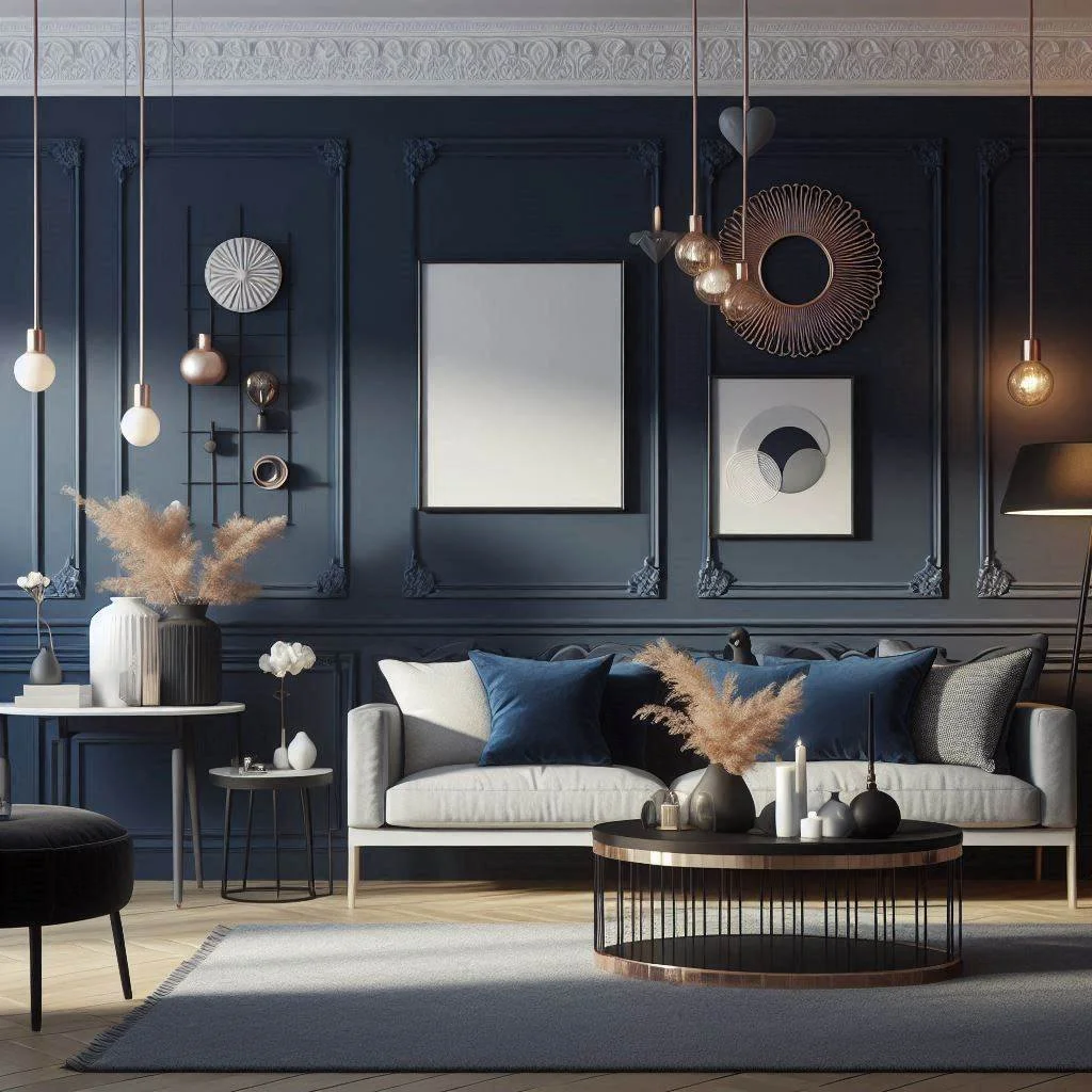 For a glamorous twist, incorporate metallic accents like copper-framed mirrors or silver side tables to elevate the space. These shiny, reflective elements create a striking contrast against the deep, rich tones of navy blue, adding an element of luxury and sophistication to the room. Copper, with its warm, earthy shine, complements the coolness of navy blue, while silver offers a sleek, modern touch that brightens the space. Whether you choose bold, statement pieces or more subtle metallic accents, they will enhance the depth and drama of the navy backdrop. The combination of navy blue with metallic finishes adds a contemporary yet elegant vibe to your living room, creating a space that feels both inviting and chic. This dynamic pairing transforms any room into a stylish, glamorous haven.