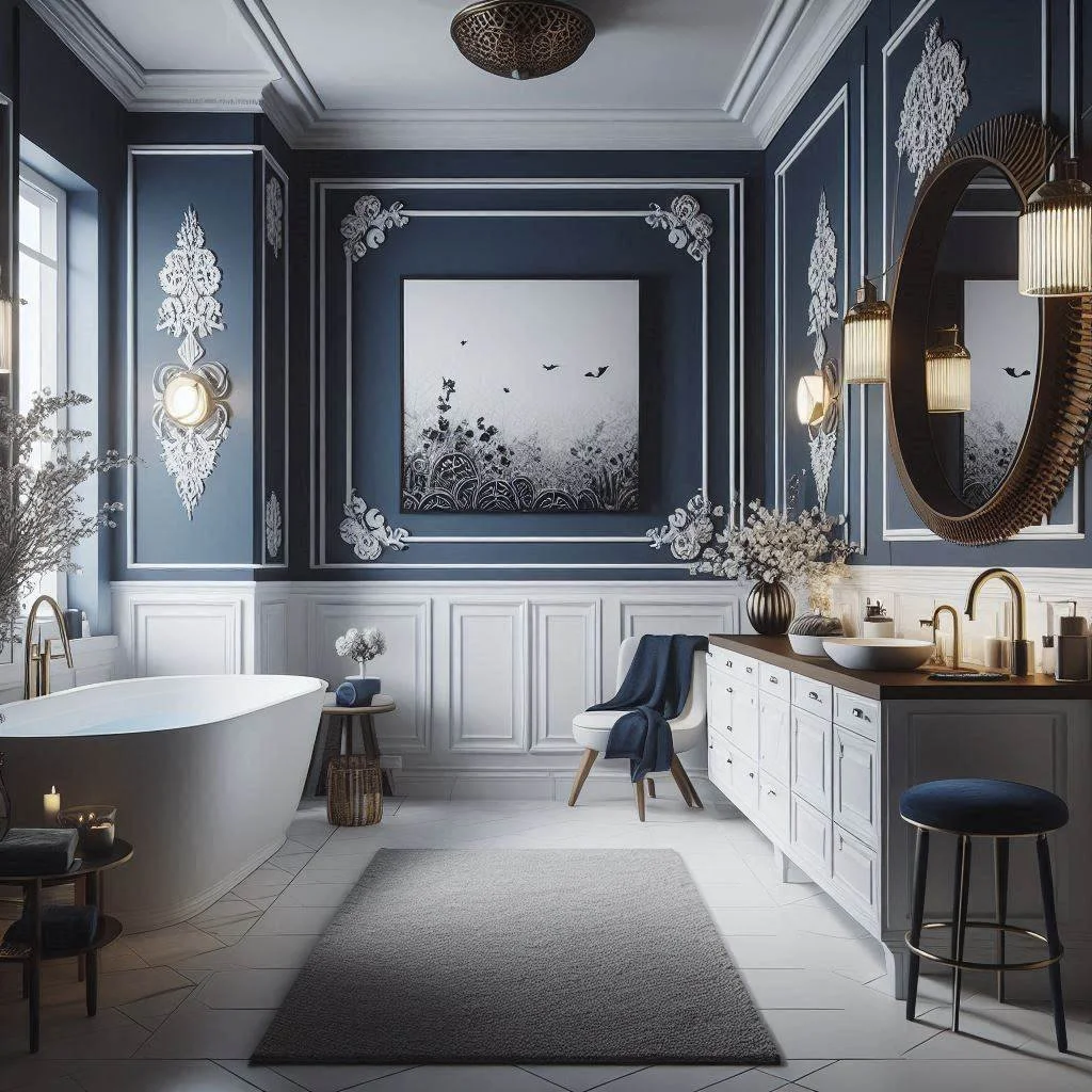 Transform your bathroom into a spa-like retreat by incorporating navy accent walls paired with crisp white tiles. The deep navy creates a calming, serene atmosphere, making the space feel like a tranquil escape. The white tiles provide a clean, fresh contrast to the navy, enhancing the light and airy feel of the room. To elevate the space and add a touch of luxury, incorporate gold fixtures, such as faucets, towel bars, or light fixtures. The warm gold tones create an elegant, timeless look that complements the cool navy and white palette. This combination of navy, white, and gold exudes sophistication and relaxation, making it perfect for creating a spa-inspired bathroom that feels both luxurious and inviting.