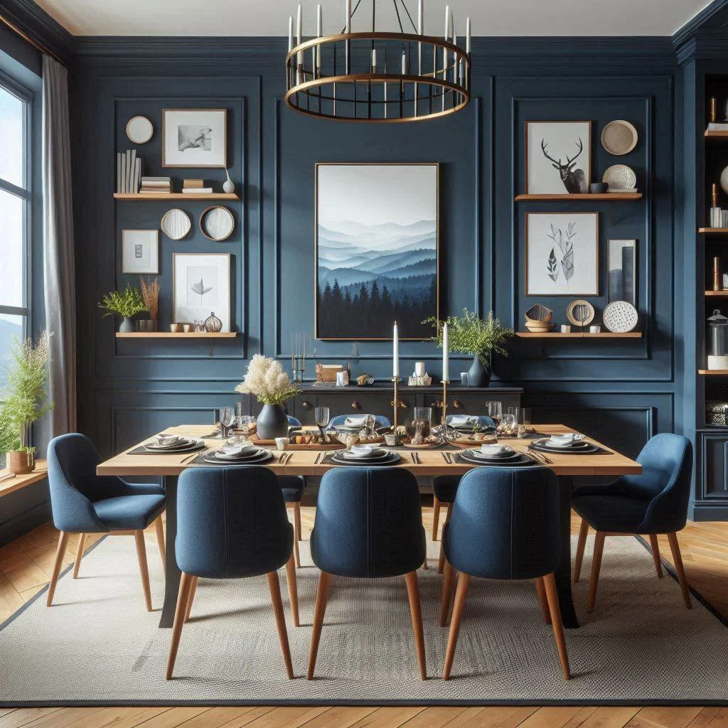 In the dining room, navy walls paired with natural wood furniture create a warm and inviting ambiance, combining the richness of the dark color with the earthy tones of wood. The deep navy adds depth and sophistication to the room, while the natural wood brings warmth and a sense of groundedness. To keep the space balanced and prevent the room from feeling too heavy, use light-colored table runners or place settings. White, beige, or soft gray linens offer a subtle contrast to the navy walls, brightening the table while maintaining a harmonious, welcoming atmosphere. This combination of bold navy and natural wood, along with light accents, creates an elegant yet cozy dining space perfect for both casual meals and formal gatherings.