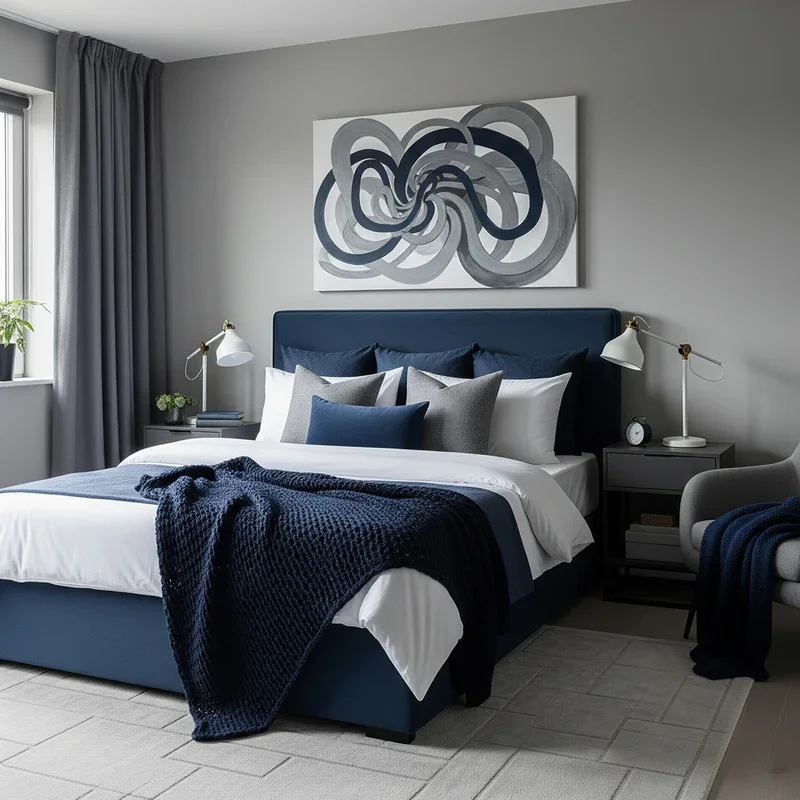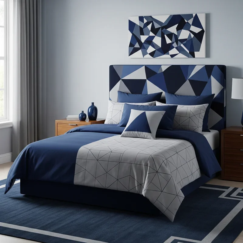 Introduce visual excitement through geometric patterns that combine navy and grey in striking designs that feel both modern and timeless. Geometric patterns are having a major moment! Consider a feature wall with hexagonal wallpaper alternating between navy and various grey tones. Or choose bedding with chevron, herringbone, or diamond patterns that incorporate both colors. The key is balancing busy patterns with solid colors to prevent visual overload. Large-scale geometrics work beautifully on accent walls or rugs, while smaller patterns suit throw pillows and curtains. Mix angular patterns with curved elements in your furniture to create dynamic contrast. A geometric area rug can define your sleeping zone while adding artistic flair. Your geometric elements become the visual rhythm that keeps the eye moving and interested throughout the space.