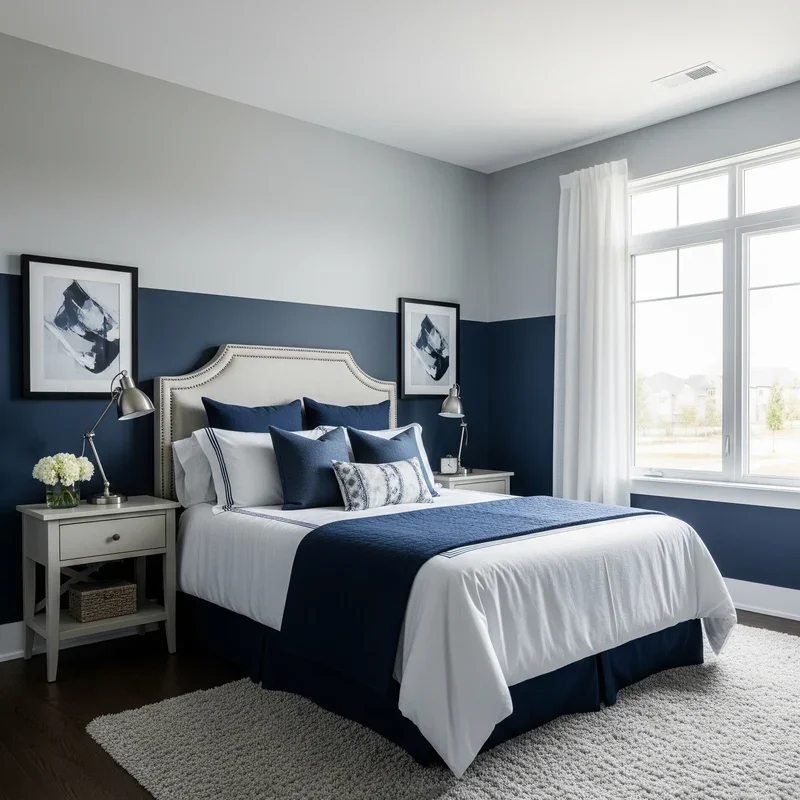 Why settle for one color when you can have the best of both worlds with a creative two-tone wall treatment? Paint the lower half of your walls in sophisticated navy and the upper portion in calming grey! This technique, reminiscent of classic wainscoting, adds architectural interest without any actual construction. The horizontal color break naturally draws the eye upward, making ceilings appear higher and rooms feel more spacious. Position the color divide at chair rail height, approximately 36 inches from the floor, for traditional proportions. Use painter's tape to achieve crisp, clean lines that look professionally done. This approach works especially well in bedrooms with lower ceilings or limited natural light. Add a thin white or metallic stripe at the division point for extra elegance. Your two-tone walls become a design statement that's both timeless and thoroughly modern.