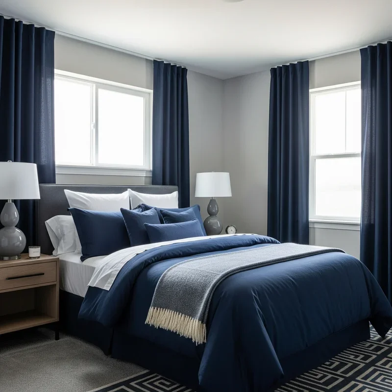 Frame your windows with dramatic navy curtains against grey walls for a classic combination that never goes out of style. Window dressing done right! Floor-to-ceiling navy drapes create vertical lines that make windows appear larger and ceilings higher. The deep blue against grey walls provides beautiful contrast without overwhelming the space. Choose blackout curtains for better sleep and energy efficiency. Layer with sheer grey panels for daytime privacy without sacrificing natural light. Hang curtains close to the ceiling and extend beyond window frames to maximize the illusion of size. Add grey and navy patterned roman shades for extra light control and visual interest. Your navy curtains become the elegant frames that complete your bedroom's sophisticated composition.