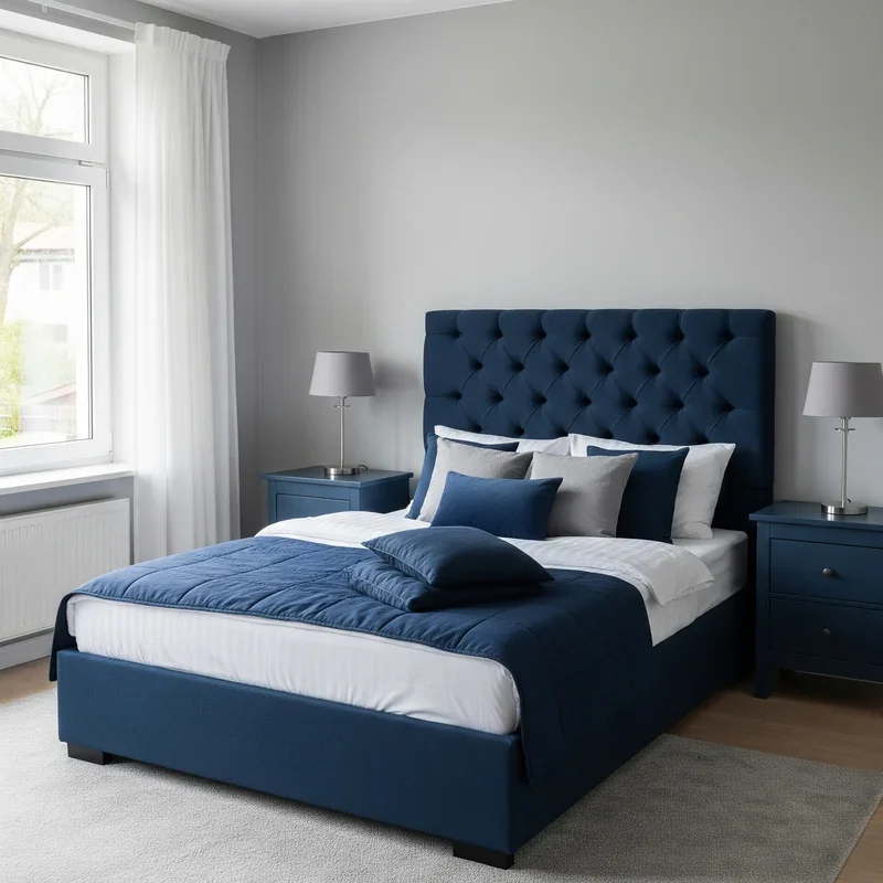 Make a statement with a luxurious velvet headboard in deep navy that becomes your bedroom's crown jewel against subtle grey walls. Velvet equals instant elegance! The plush texture adds depth and richness that flat fabrics can't match, while the navy color creates a dramatic focal point. Choose a tufted design for extra visual interest and that classic, timeless appeal. The soft grey walls allow the headboard to truly shine without competition. Complement with grey velvet throw pillows to tie the textures together throughout the space. Add navy piping to grey bedding for a custom, cohesive look. The contrast between matte grey walls and lustrous navy velvet creates sophisticated visual tension. Your velvet headboard becomes the luxurious centerpiece that makes your bedroom feel like a five-star hotel suite.