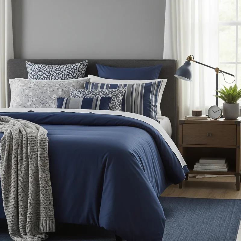 Master the art of pattern mixing by combining different navy and grey designs in your bedding for a layered, designer look. Pattern play perfection! Start with a geometric grey duvet, add navy pinstriped sheets, and top with floral throw pillows incorporating both colors. The secret is varying the scale: large patterns, medium patterns, and small patterns or solids. Include at least one solid element to give the eye a rest. Stripes, dots, florals, and geometrics can all coexist when they share the same color palette. This approach creates visual richness that plain bedding can't achieve. Don't forget a textured throw blanket to add another dimension. Your pattern-mixed bedding becomes a masterclass in sophisticated coordination that looks effortlessly pulled together.