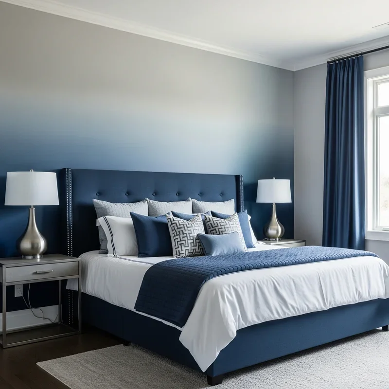 Create a dreamy, artistic backdrop with an ombre wall that gradually transitions from deep navy at the base to pale grey at the ceiling. Gradient goals achieved! This painting technique adds incredible visual interest while maintaining the sophisticated color palette. The gradual transition creates a sense of movement and flow that static paint colors can't achieve. Start with the darkest navy at floor level, gradually lightening through various blue-grey shades. Use a sponging technique for seamless blending between colors. This treatment works especially well on the wall behind your bed, creating a stunning backdrop. The ombre effect naturally draws the eye upward, making rooms feel taller and more spacious. Your gradient wall becomes a piece of art that transforms your bedroom into a gallery-worthy space.