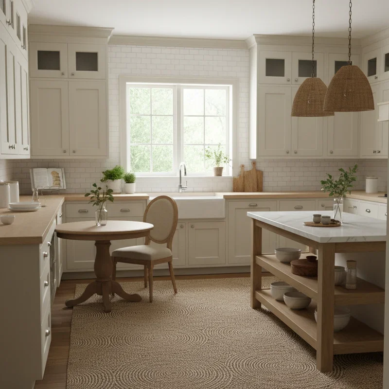 Rugs in your kitchen might seem unconventional, but they're game-changers for adding warmth and defining spaces within open floor plans. Natural fiber rugs like jute, sisal, or wool in neutral tones provide cushioning underfoot while adding texture that softens hard surfaces. Choose low-pile options that are easy to clean and won't trap crumbs, positioning them strategically in front of sinks or islands where you stand most. These organic materials complement your neutral palette perfectly while adding an unexpected layer of comfort that makes cooking more enjoyable. Washable cotton rugs offer practicality for high-traffic areas while maintaining that casual, lived-in feel that prevents neutral kitchens from feeling too precious. The texture and warmth underfoot make your kitchen feel more like a living space than a work zone.