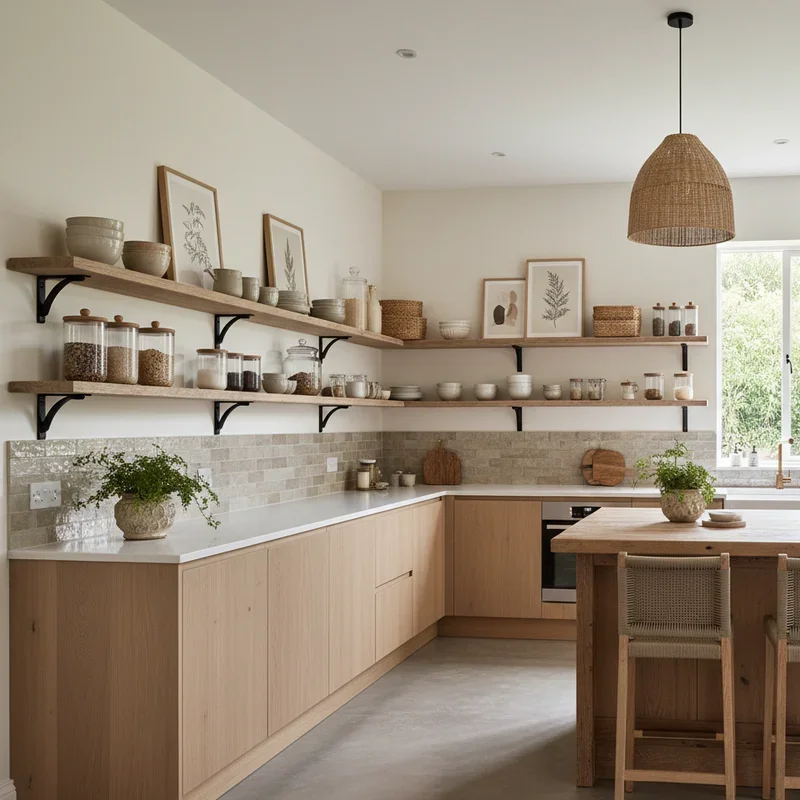 Open shelving transforms your kitchen from purely functional to personally expressive, showcasing your favorite dishes like art in a gallery. Natural wood shelves bring warmth while keeping things light and airy, perfect for smaller kitchens that need breathing room. Display cream-colored ceramics, woven baskets, and glass jars filled with pantry staples for a lived-in look that's both practical and beautiful. The key to successful open shelving lies in thoughtful curation; group items by color and height for visual harmony. Mix functional pieces with decorative elements like small potted herbs or vintage finds. This storage solution encourages you to keep only what you love and use, naturally decluttering your space. Open shelves also make your kitchen feel more welcoming, inviting guests to feel at home.