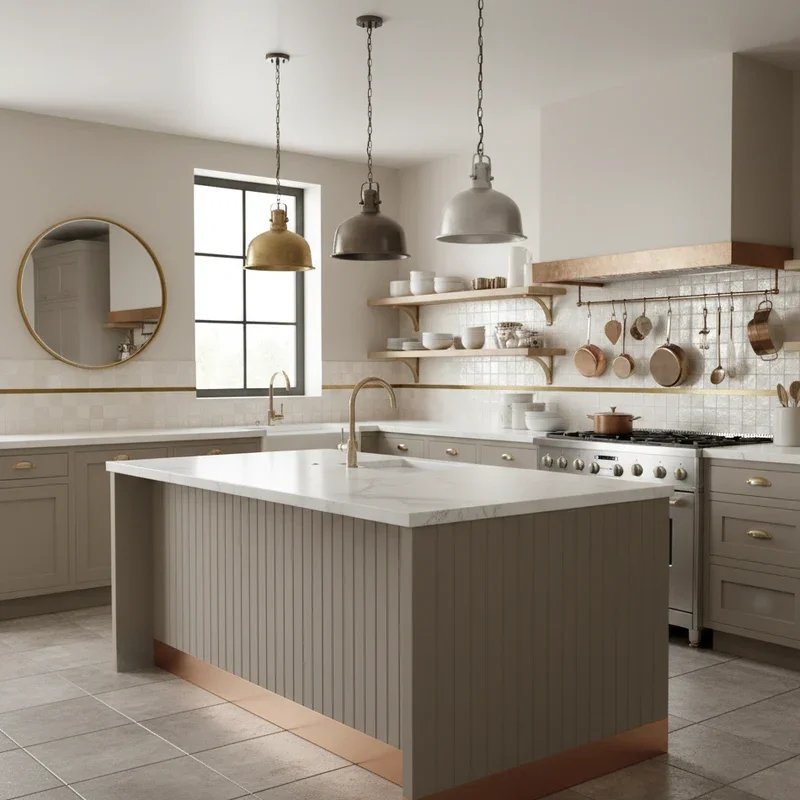 Gone are the days when everything had to match perfectly! Mixing metals adds sophistication and prevents your neutral kitchen from feeling too predictable. Combine brushed gold cabinet pulls with copper pendant lights, or pair stainless steel appliances with brass faucets for an collected-over-time aesthetic. The warmth of copper and brass naturally complements neutral palettes, while cooler metals like nickel provide balance. Think of it as creating a jewelry collection for your kitchen where each piece contributes to the overall story. The trick is maintaining balance; choose one dominant metal and use others as accents. This approach adds layers of visual interest without cluttering your clean neutral canvas. Mixed metals also give you flexibility when updating your kitchen gradually since you're not locked into one finish.