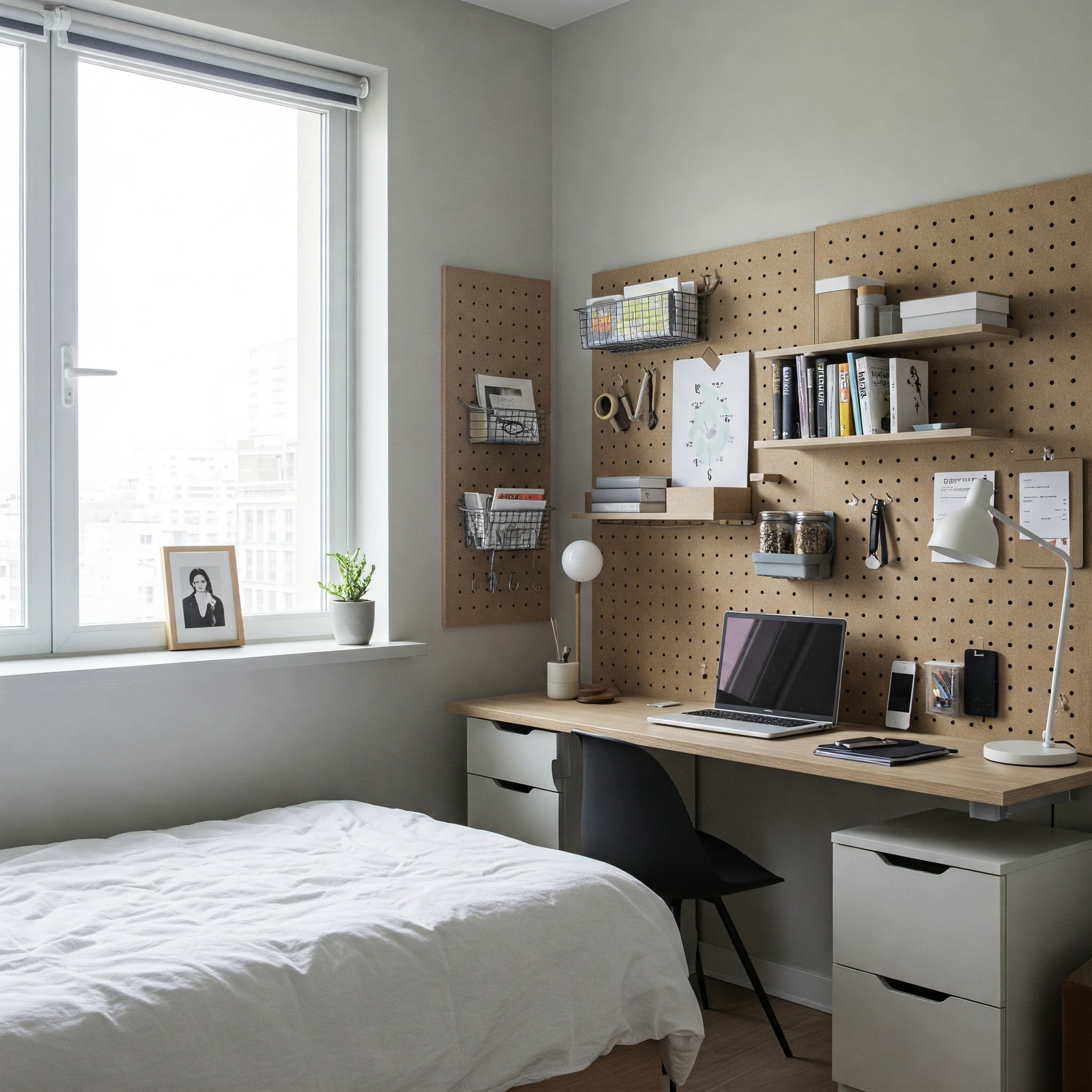 When square footage is limited, sometimes the only way to go is up—literally. Vertical organization solutions like pegboards can help you make the most of blank walls. Pegboards are incredibly versatile: you can hook on baskets for office supplies, hang small potted plants, or even clip on photos and motivational quotes. In a single glance, you’ll see what you need and where it is. If you prefer a cleaner look, consider painting the pegboard a color that complements your décor, whether that’s a soothing pastel or a vibrant statement shade. You can then arrange your tools or decorative items in a pattern that looks intentional, almost like wall art. This system keeps surfaces clear, leaving more space for your bed or seating area, and it introduces a playful, creative energy to the room.