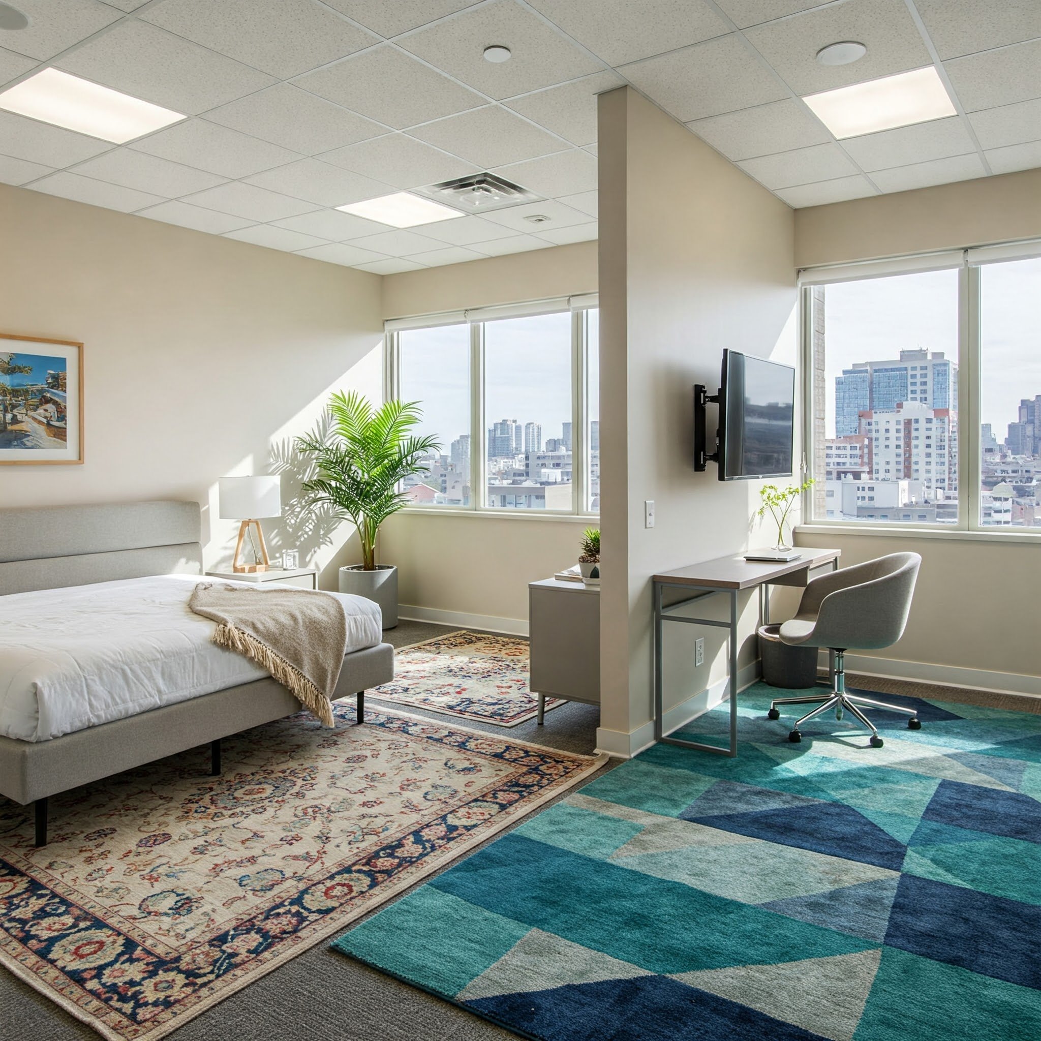 A single room can play multiple roles, and rugs are a simple yet effective way to visually carve out those distinct zones. For instance, place a cozy area rug under the bed or sofa bed to mark the “sleeping and relaxation” section, while a different style or texture beneath the desk signals your “work zone.” This trick doesn’t require walls or partitions; instead, the rugs do the talking by letting you—and any guests—know where one area ends and another begins. When selecting rugs, consider color coordination: perhaps choose a neutral rug for the office corner and a patterned one for the guest area, or vice versa. By contrasting designs, you can reinforce the idea that these are two separate spaces coexisting in harmony. It’s like drawing invisible lines on the floor that guide you through your office guest room’s multiple personalities.