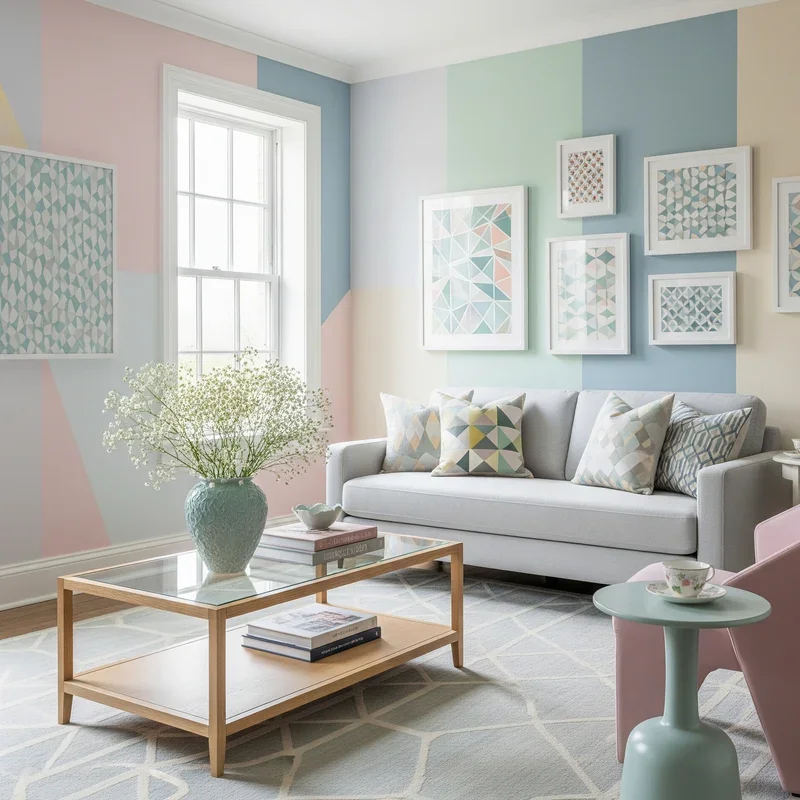 Add structure to softness with geometric patterns in pastel hues that prove gentle colors can make bold statements! Think triangles in rotating pastels, hexagons creating honeycomb effects, or chevron stripes in mint and pink. These patterns work through wallpaper, painted accent walls, or textiles like rugs and bedding. The key lies in scale: large patterns make bold statements while smaller ones create texture without overwhelming. Mix geometric elements with solid pastels to prevent visual chaos; let patterns be focal points while solids provide rest. Modern geometric designs in pastels bridge contemporary and soft aesthetics perfectly. Use painter's tape to create DIY geometric walls, choosing three to four pastels for cohesion. The angular nature of geometric patterns adds energy that prevents pastel rooms from feeling too relaxed or feminine. This approach particularly suits those wanting pastel rooms that feel fresh and modern.