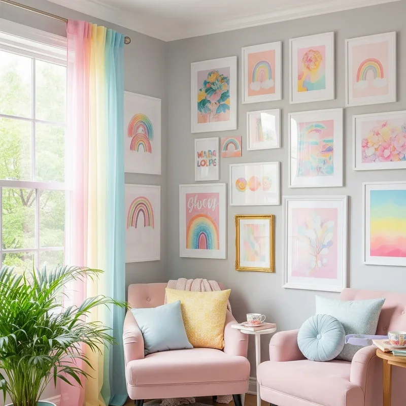 Why choose one pastel when you can have them all in a stunning gallery wall that celebrates every shade of soft? Create visual harmony by selecting artwork, prints, and photos that each feature different pastel hues while maintaining similar intensities. Mix media fearlessly: watercolor paintings next to pastel photography, pressed flowers in soft-colored frames beside typography in mint and peach. The trick lies in maintaining balance; distribute colors evenly rather than clustering all pinks in one corner. Include white or cream pieces as visual breathing room between colors. Frame styles can vary from vintage gold to modern acrylic, united by the pastel theme. Start with larger anchor pieces and build around them, letting the arrangement grow organically. This approach transforms blank walls into conversation starters that showcase your personality while maintaining that dreamy aesthetic. Your rainbow gallery becomes a focal point that ties together all other pastel elements.