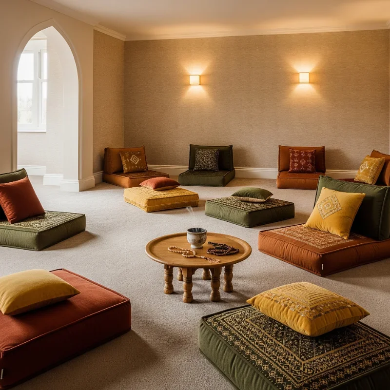 Create an intimate connection with the earth by designing your prayer room around comfortable floor seating arrangements. Large meditation cushions, called zafus, provide proper support for extended prayer sessions while maintaining good posture. Layer different sizes of pillows to accommodate various prayer positions, from kneeling to cross-legged sitting. Moroccan floor cushions or Japanese zabutons add cultural richness while ensuring comfort during longer spiritual practices. The low seating naturally encourages humility and grounding, essential elements in many prayer traditions. Arrange cushions in a circle for group prayers or meditation sessions with family. Soft throws and blankets nearby offer warmth during early morning or late evening devotions. This flexible seating arrangement allows you to modify the space based on your needs, whether practicing alone or hosting prayer gatherings.