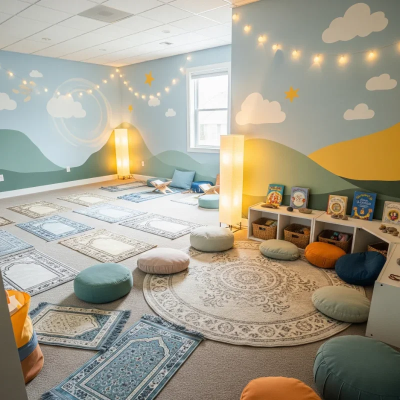 Design a special prayer space that makes spirituality accessible and engaging for young hearts and minds. Lower furniture and cushions accommodate smaller bodies while creating a space that feels truly theirs. Colorful artwork depicting spiritual stories or peaceful scenes makes abstract concepts more tangible. A feelings chart helps children identify and pray about their emotions. Soft toys or prayer bears provide comfort during quiet reflection times. Simple musical instruments allow expressive prayer through sound and movement. Books with spiritual themes for various ages encourage independent exploration. This dedicated space teaches children that prayer and reflection are valuable parts of daily life worth having their own special place.
