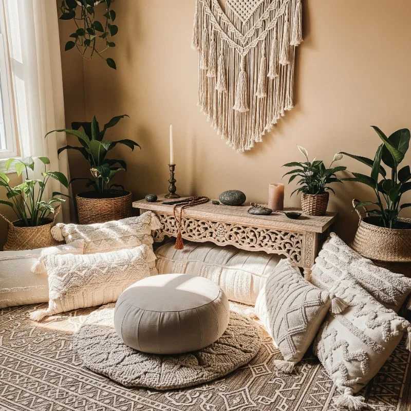 Express your free spirit with a bohemian prayer space featuring rich textures, vibrant colors, and eclectic spiritual elements. Layer colorful tapestries, mandala wall hangings, and ethnic textiles to create visual warmth and cultural diversity. Mix prayer beads, singing bowls, and crystals from various traditions to honor the universal nature of spirituality. Low-hanging fabric creates a tent-like atmosphere that feels both cozy and exotic. Vintage rugs layered on the floor provide comfort while adding pattern and color depth. Macramé wall hangings and dream catchers add handmade touches that make the space uniquely yours. This style celebrates the belief that spirituality doesn't require austere surroundings but can thrive in joyful, expressive environments. The bohemian approach allows your personality to shine through your prayer practice, making spiritual time feel authentic and personal.