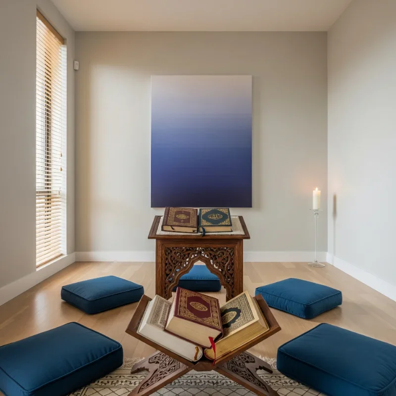 Center your prayer room around beautifully displayed sacred texts that serve as both inspiration and decoration. Floating shelves showcase ornate religious books, creating a library-like atmosphere of wisdom and learning. A dedicated reading stand or lectern provides proper support for studying sacred writings during prayer. Rotate displayed passages weekly to maintain fresh inspiration and prevent habituation. Calligraphy or illuminated verses framed on walls add artistic beauty while reinforcing spiritual messages. Proper lighting ensures comfortable reading without eye strain during extended study sessions. The visible presence of sacred texts reminds you of divine wisdom and guidance available through scripture. This design particularly suits those whose spiritual practice involves regular scripture study and contemplation.