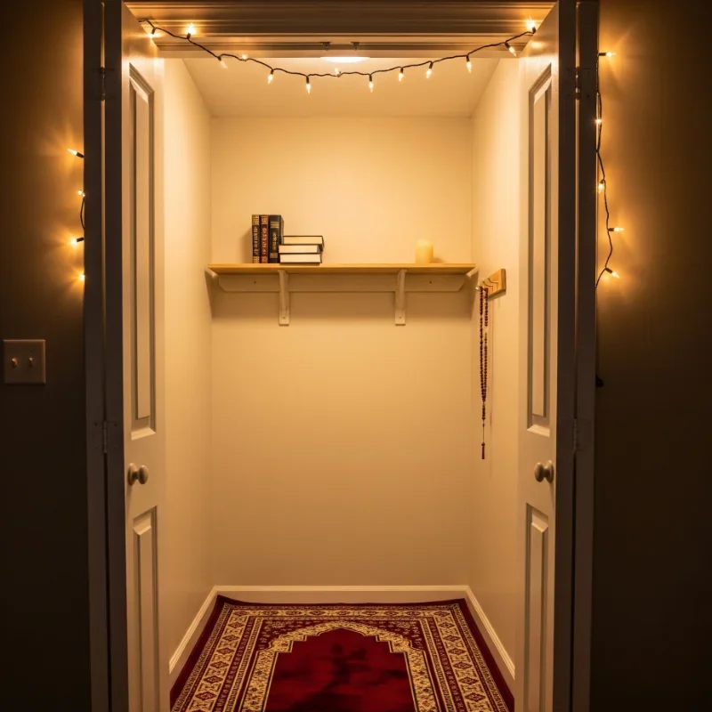Even a 3x3 foot corner can work; closets and alcoves make perfect prayer spaces.