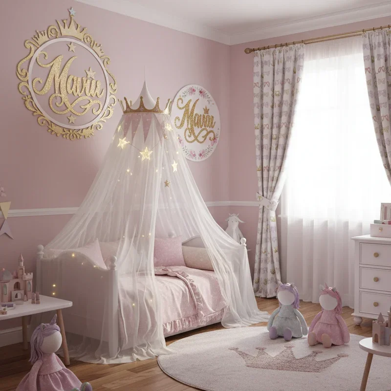 Nothing makes a space truly yours like personalized elements! A custom name sign declares "This is Princess [Name]'s Royal Chamber!" Choose from countless options: carved wooden signs, illuminated marquee letters, vinyl wall decals, or hand-painted canvases. Include their name with phrases like "Princess" or "A Dream is a Wish Your Heart Makes." Size matters; go big for impact or keep it intimate and sweet. Position it above the bed, on the door, or on a feature wall. Some signs incorporate actual crowns or 3D elements for added dimension. Match the sign's style to your overall room aesthetic, whether that's rustic, modern, vintage, or whimsical. DIY options include painting their name on a canvas with decorative elements, creating a name banner with fabric flags, or using wooden letters decorated with paint and embellishments. Personalization makes the space uniquely theirs!