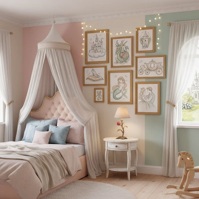 While pink remains a princess classic, don't feel limited! Purple conveys royalty and pairs beautifully with gold accents. Soft lavender and lilac create calming, sophisticated spaces. Aqua and turquoise work perfectly for ocean-loving princesses. Mint green offers freshness while maintaining femininity. Peach and coral bring warmth without being overly sweet. Consider metallics like rose gold, champagne, or silver as accent colors that add elegance. Two or three-color combinations create depth and interest. For example, blush pink with gold and cream feels timeless and grows with your child. Don't forget about white and ivory as base colors that make other hues pop! You can also draw inspiration from specific princess color schemes. The key is creating a palette that reflects your child's personality while maintaining that magical, royal feeling they're after!