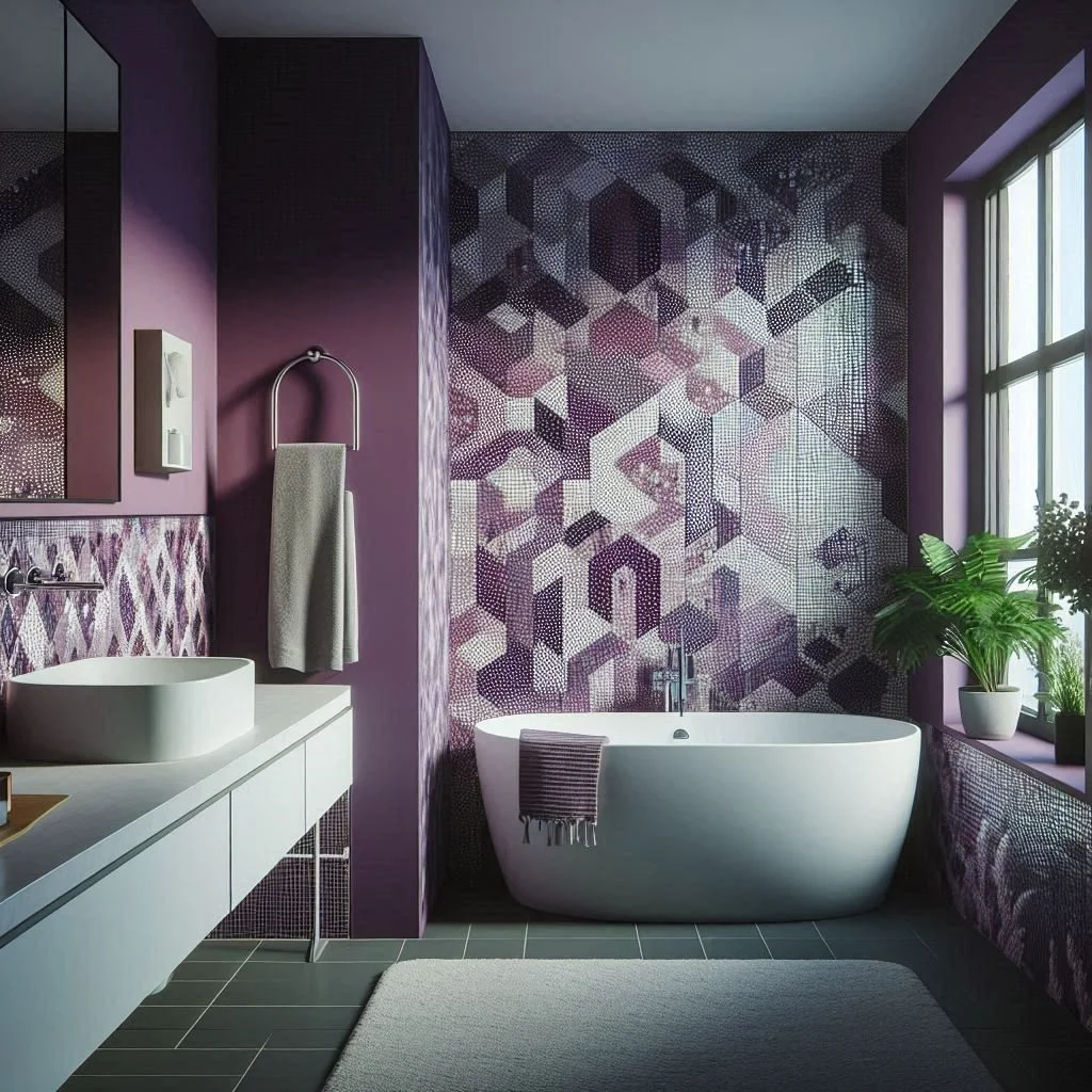 A purple mosaic backsplash can be a stunning focal point in your bathroom. Use tiles in varying shades of purple to create a dynamic, textured look. This design works well behind a vanity or bathtub, adding a touch of artistry and elegance. The interplay of different hues and the intricate patterns formed by the mosaic tiles can make the space feel both vibrant and sophisticated. Additionally, a purple mosaic backsplash can seamlessly tie together other elements of the bathroom decor, from fixtures to accessories, creating a cohesive and visually appealing environment. This elegant and creative touch can transform an ordinary bathroom into a luxurious retreat.