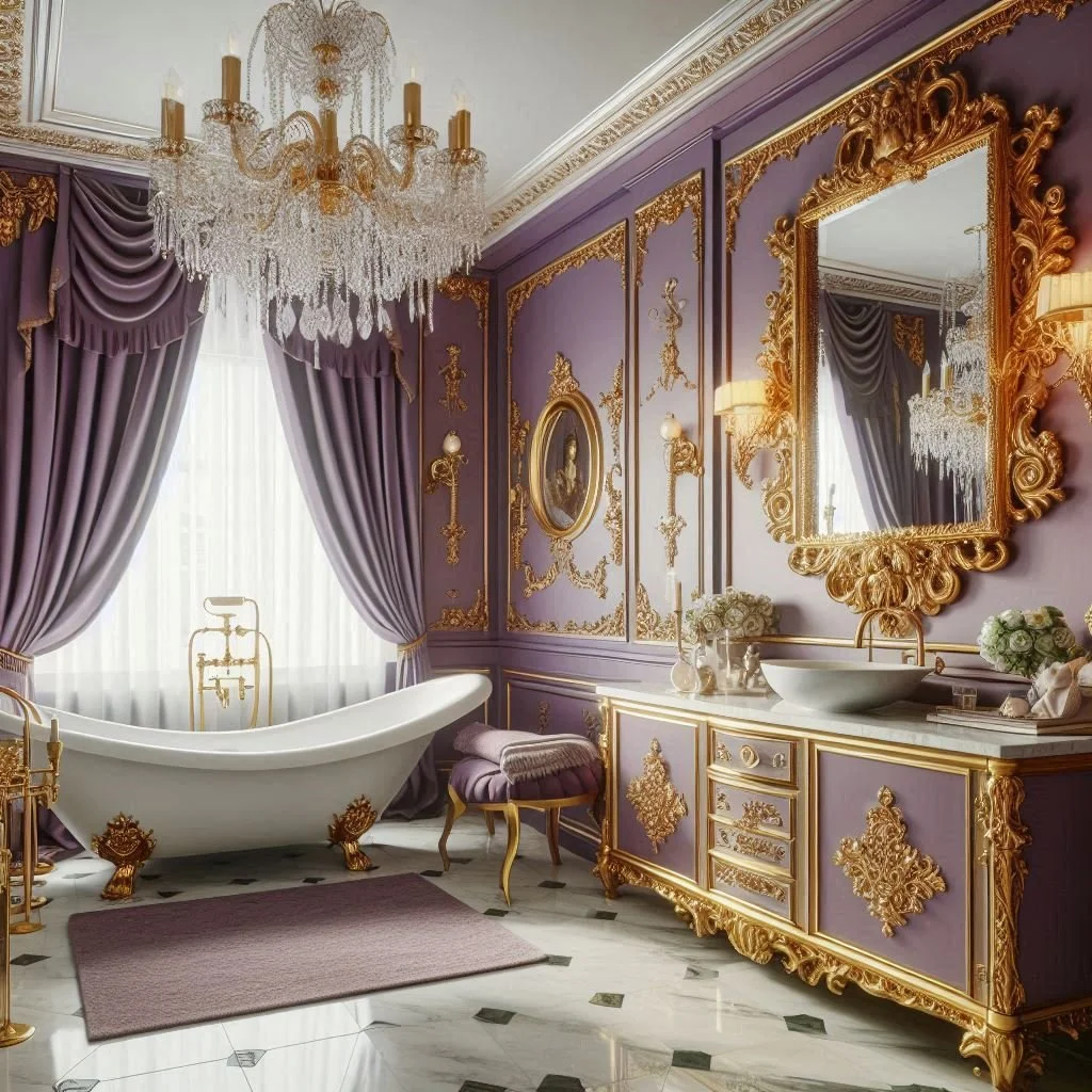 Pair purple with gold for a truly regal bathroom. Gold fixtures, mirrors, and accessories add a touch of luxury that beautifully complements the richness of purple. This combination exudes sophistication, making your bathroom feel like a high-end retreat. Imagine deep purple walls accented by gleaming gold faucets, towel bars, and a statement mirror with a gold frame. The interplay of these colors creates an opulent and inviting atmosphere, perfect for indulging in a bit of everyday luxury. Whether you opt for bold purple tiles or subtle lavender accents, the addition of gold elements ensures a timeless, elegant look that transforms your bathroom into a stunning sanctuary.