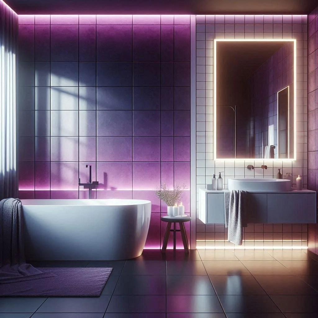 Lighting can dramatically change the atmosphere of a room. Install purple LED lights or choose light fixtures with purple shades to add a subtle, enchanting glow. Purple lighting creates a relaxing and soothing environment, perfect for unwinding after a long day. Whether you use LED strips around the mirror or opt for a chandelier with purple accents, this lighting can transform your bathroom into a serene oasis. Pairing purple lights with dimmer switches allows you to adjust the brightness, tailoring the ambiance to your mood. This touch of color not only enhances the decor but also promotes a calming, spa-like experience in your bathroom.