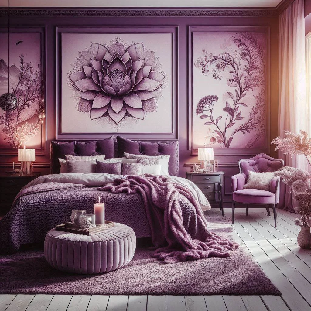 Artistic wall decor adds a personal touch to your bedroom and can seamlessly integrate with your purple color scheme. Opt for purple-themed artwork, such as paintings, prints, or photographs, to complement your decor. Tapestries and murals can also serve as dramatic focal points, infusing your space with creativity and flair. Select pieces that resonate with your personal style and arrange them thoughtfully to enhance the room's overall design. Whether you prefer bold abstracts or subtle watercolors, incorporating art into your bedroom decor not only enriches the visual appeal but also creates a space that feels uniquely yours.