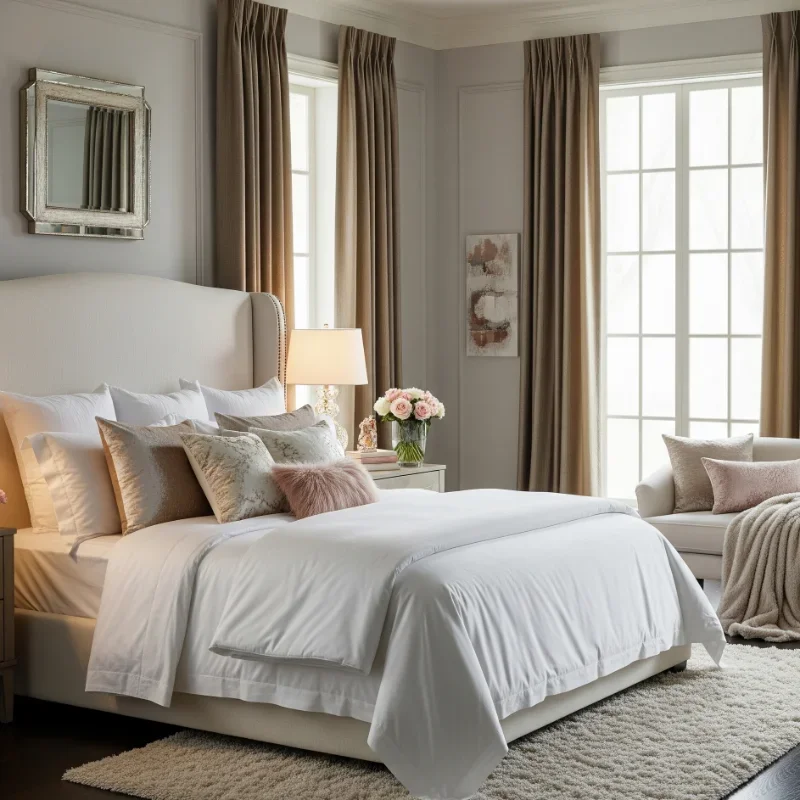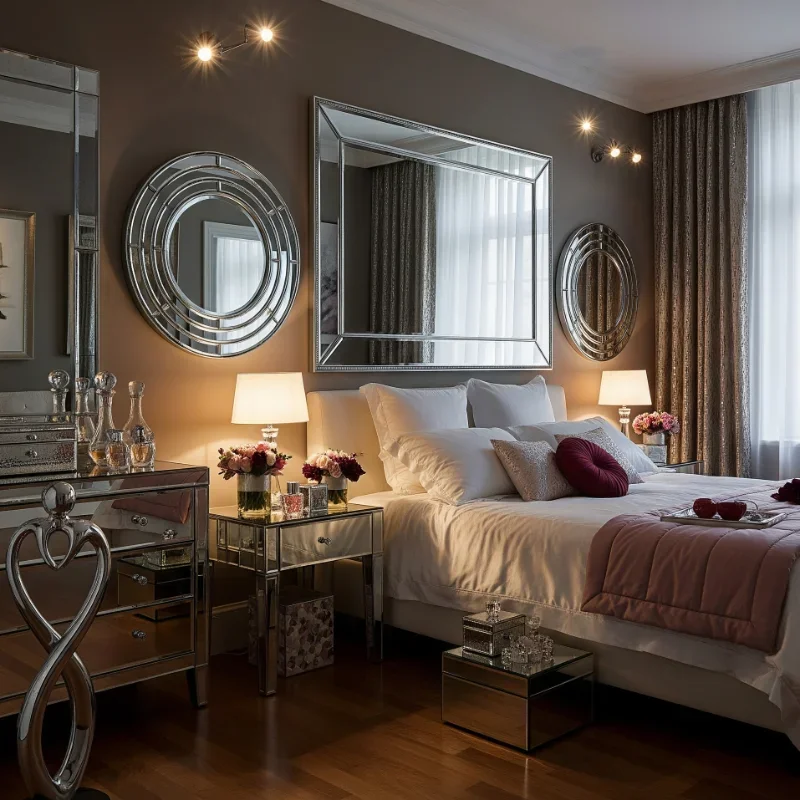 Strategically placed mirrors amplify romance by enhancing light, space, and intimate connections! A large mirror opposite windows doubles natural light while creating depth. Antique mirrors add character with their imperfect reflections softening appearances. Position mirrors to reflect beautiful views or candlelight, multiplying romantic elements. Avoid placing mirrors directly facing the bed if it feels intrusive. Mirrored furniture like nightstands or dressers adds glamour without overwhelming. Consider mirror collections creating artistic focal points. Venetian mirrors bring Old World romance while modern geometric designs feel fresh. The key lies in balance; too many mirrors feel cold rather than cozy. Use mirrors to check in with each other throughout the room, maintaining visual connection. Reflective surfaces like metallic frames or glass accessories add sparkle without full mirror impact. These elements make rooms feel larger and brighter while adding touch of magic.