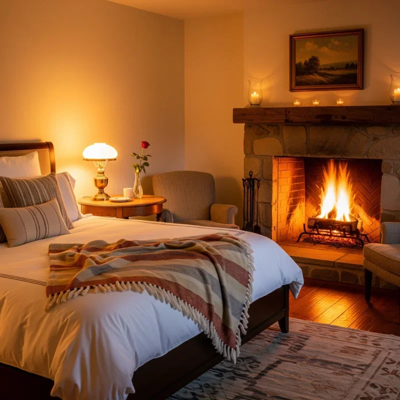 Nothing kindles romance quite like the dancing flames of a bedroom fireplace! If you're blessed with a real fireplace, make it your focal point with comfortable seating arranged for fire gazing. No chimney? Electric or gas inserts provide ambiance without construction. Even LED flame effects create cozy atmosphere. Decorate mantels with candles, photos, or seasonal elements. The warmth draws couples together naturally while providing flattering, flickering light. Consider portable electric fireplaces that move where needed. Beyond visual appeal, fireplaces offer primal comfort, connecting us to centuries of gathering around flames. Add a soft rug before the hearth for spontaneous fireside picnics. Stack decorative logs even with electric units for authentic styling. The fireplace becomes your bedroom's heart, literally and figuratively warming your space. This feature transforms ordinary bedrooms into romantic retreats worthy of mountain lodges or historic inns.