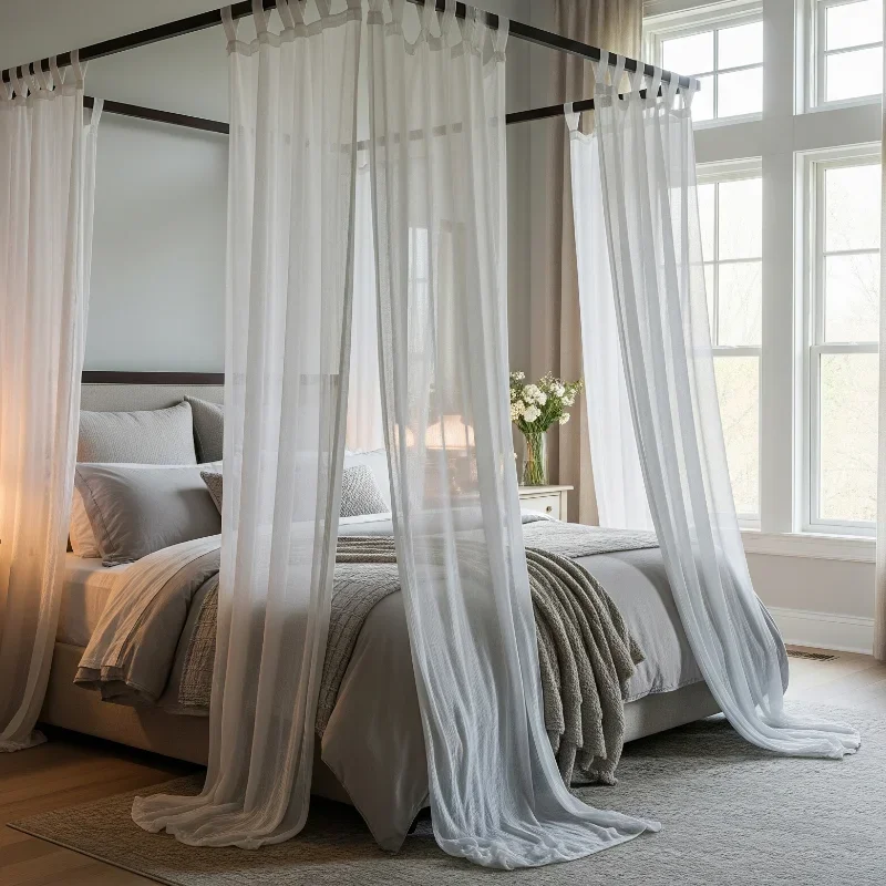 Create your own private paradise with the timeless romance of canopy beds and flowing fabrics! Even without a four-poster bed, you can achieve this dreamy look using ceiling-mounted curtain rods or a simple wooden frame. Hang sheer white curtains for ethereal beauty, or choose rich velvets for dramatic coziness. The fabric creates an intimate cocoon, blocking out the world and focusing attention inward. Tie back drapes with silk scarves during the day, letting them flow freely at night. Add string lights within the canopy for starlight effects. This setup transforms ordinary beds into magical retreats worthy of fairy tales. The gentle movement of fabric in air currents adds life to your space. Whether you prefer bohemian mosquito netting or luxurious damask, canopies instantly elevate romance levels while providing psychological comfort through enclosure.