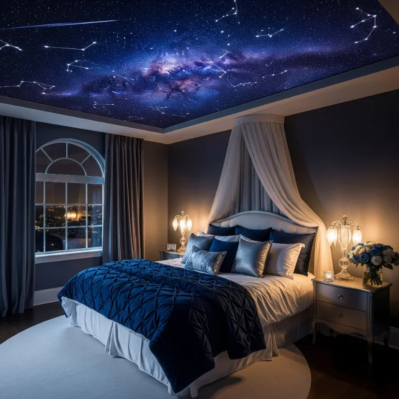 Turn bedtime into a celestial experience with romantic ceiling features that inspire wonder! Paint subtle metallic stars across deep blue ceilings for subtle shimmer. Glow-in-the-dark star stickers create childhood magic for adults. More ambitious? Install fiber optic star ceilings for realistic constellation effects. Skylights bring real stars indoors while maintaining privacy with remote-controlled shades. Project star patterns using specialized lights for temporary transformation. Consider ceiling medallions around light fixtures for architectural romance. Painted clouds during day transform to starfields at night with proper lighting. These overhead features draw eyes upward, encouraging dreamy contemplation while lying together. Position major stars or constellations meaningfully: perhaps recreating the night sky from your first date. The ceiling becomes your private planetarium, inspiring pillow talk about dreams and infinite possibilities. This unexpected design element surprises and delights, making your bedroom truly unique.