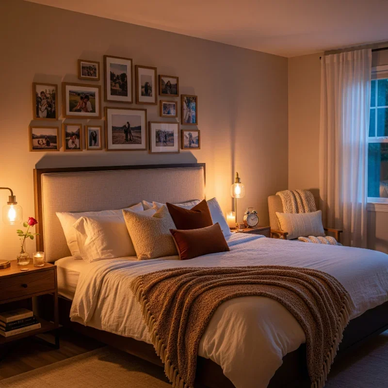 Transform blank walls into celebration of your love story through thoughtfully curated photo displays! Move beyond standard wedding photos to capture candid moments: that sunset from your first vacation, silly selfies, or quiet everyday moments. Create gallery walls mixing frame sizes and styles for visual interest. Black and white photos feel timeless and romantic. Include handwritten love notes or ticket stubs from special dates. Digital frames allow rotating displays without cluttering surfaces. Position photos where you'll see them during intimate moments but not where they feel intrusive. Mix couple photos with individual shots showing personal growth. Consider professional boudoir photography for private display. Update galleries seasonally to keep memories fresh and relevant. These visual reminders strengthen emotional bonds by celebrating shared history. Your bedroom walls become a private museum of your relationship's beautiful moments, inspiring continued romance and gratitude.