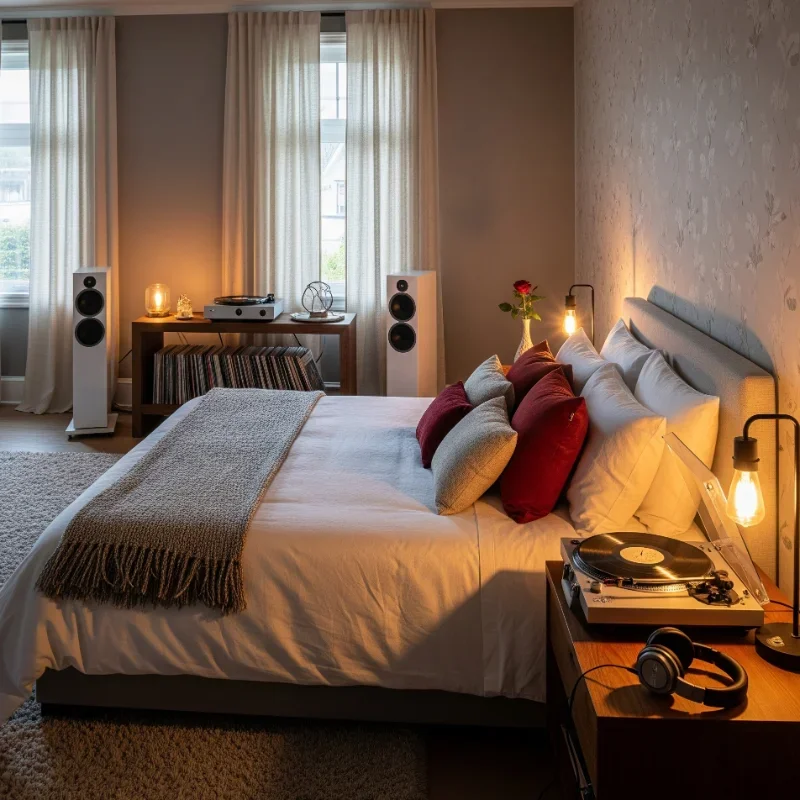 Set the romantic soundtrack of your love story with carefully planned audio elements! Install discrete speakers that fill the room with music without dominating visually. Create playlists for different moods: slow jazz for lazy mornings, classical for elegant evenings, or nature sounds for peaceful sleep. Smart speakers allow voice control without breaking intimate moments. Consider white noise machines or small fountains for consistent background ambiance. Position speakers for surround sound that envelops without overwhelming. The absence of sound matters too; use thick curtains and rugs to muffle outside noise. Some couples enjoy recording personal messages or favorite songs for surprise playback. Keep volume controls bedside for easy adjustment. Music triggers powerful emotional memories, so curate your bedroom's soundtrack thoughtfully. Whether it's your wedding song or rain sounds, audio elements add invisible layers of romance to your space.