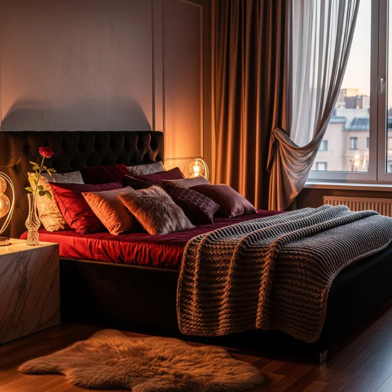 Engage all senses by layering textures that beg to be touched and experienced! Mix smooth silk pillowcases with chunky knit throws, creating contrast that keeps hands exploring. Add velvet curtains, faux fur rugs, and satin sheet sets for luxury. Incorporate unexpected textures: rough linen adds casual elegance, while cashmere screams indulgence. The key lies in balance; too many competing textures create chaos rather than comfort. Consider texture in unexpected places: fabric-wrapped books, woven baskets, or textured wallpaper behind the headboard. Each surface should invite touch, making your bedroom a tactile wonderland. Natural textures like raw wood or stone add grounding elements among softer materials. Think about how textures feel against skin, choosing materials that enhance physical comfort. This sensory richness creates a more engaging, memorable environment that stimulates romance through multiple channels beyond just visual appeal.