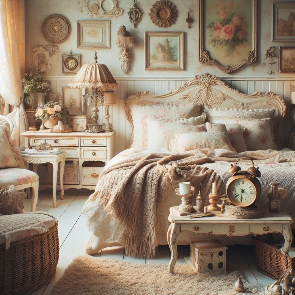 Elevate the vintage allure of your bedroom by incorporating antique mirrors, picture frames, lamps, and chandeliers that exude elegance and sophistication. Antique mirrors with ornate frames reflect light and create a sense of spaciousness, while vintage picture frames add character and nostalgia to the space. Antique lamps and chandeliers cast a warm and inviting glow, infusing the room with timeless charm and glamour. These curated accents evoke a sense of history and luxury, transporting you to a bygone era of opulence and refinement. Embrace the vintage charm of these exquisite pieces to create a bedroom that radiates elegance and grace, reminiscent of a bygone era.