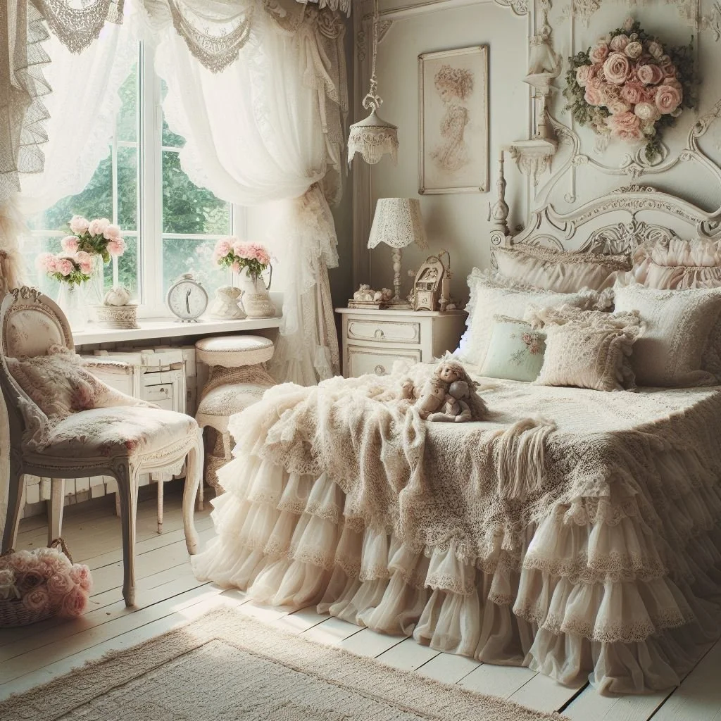 Infuse your space with an air of romance by incorporating soft lace curtains, ruffled bedskirts, and pillows that exude femininity and elegance. The delicate intricacies of lace curtains create a dreamy ambiance, filtering soft light and adding a sense of whimsy to the room. Ruffled bedskirts evoke a sense of romance and nostalgia, cascading gracefully around the bed to create a soft and inviting focal point. Paired with pillows adorned with delicate fabrics and feminine details, such as lace trim or floral embroidery, these elements exude charm and sophistication, transforming your space into a romantic retreat that invites relaxation and indulgence.