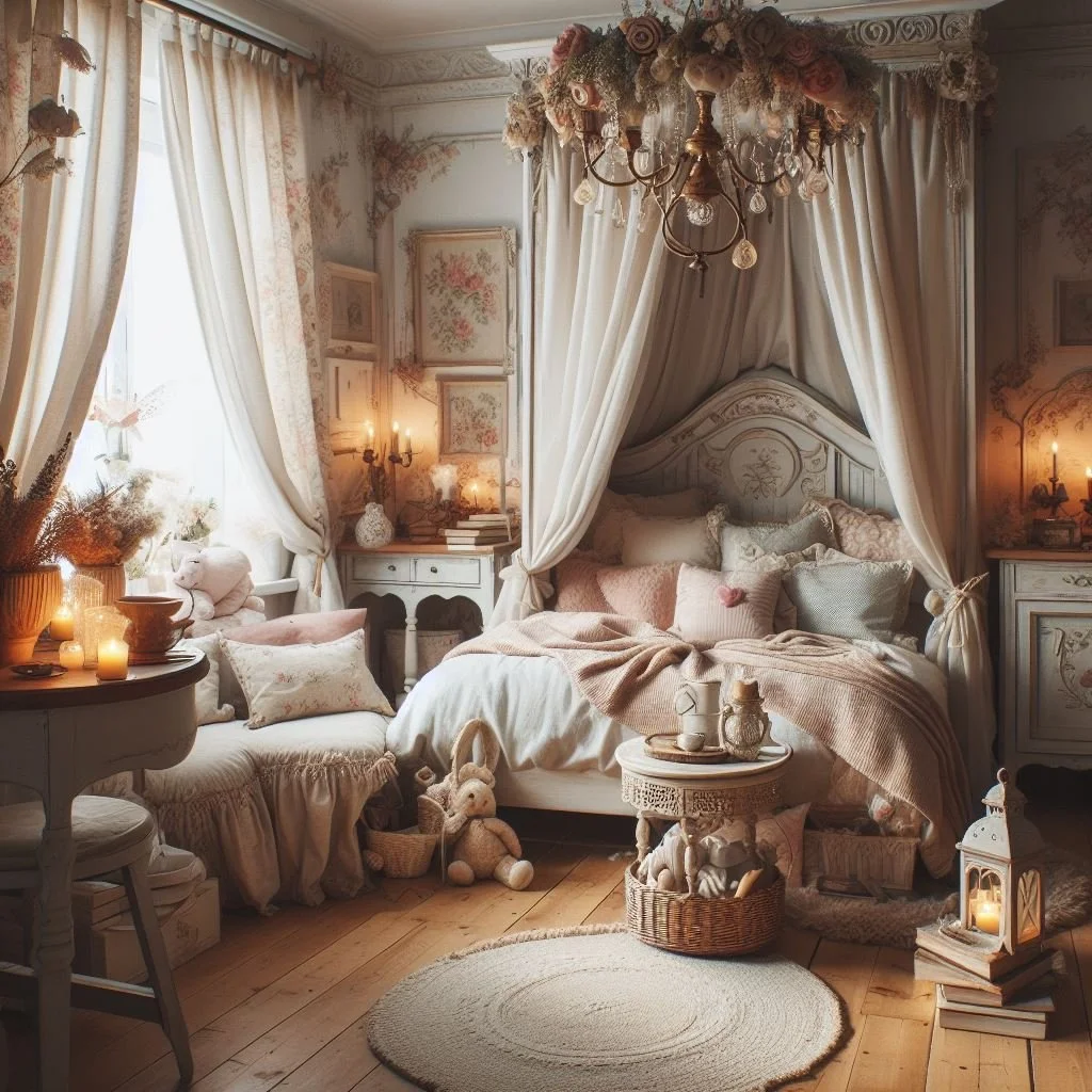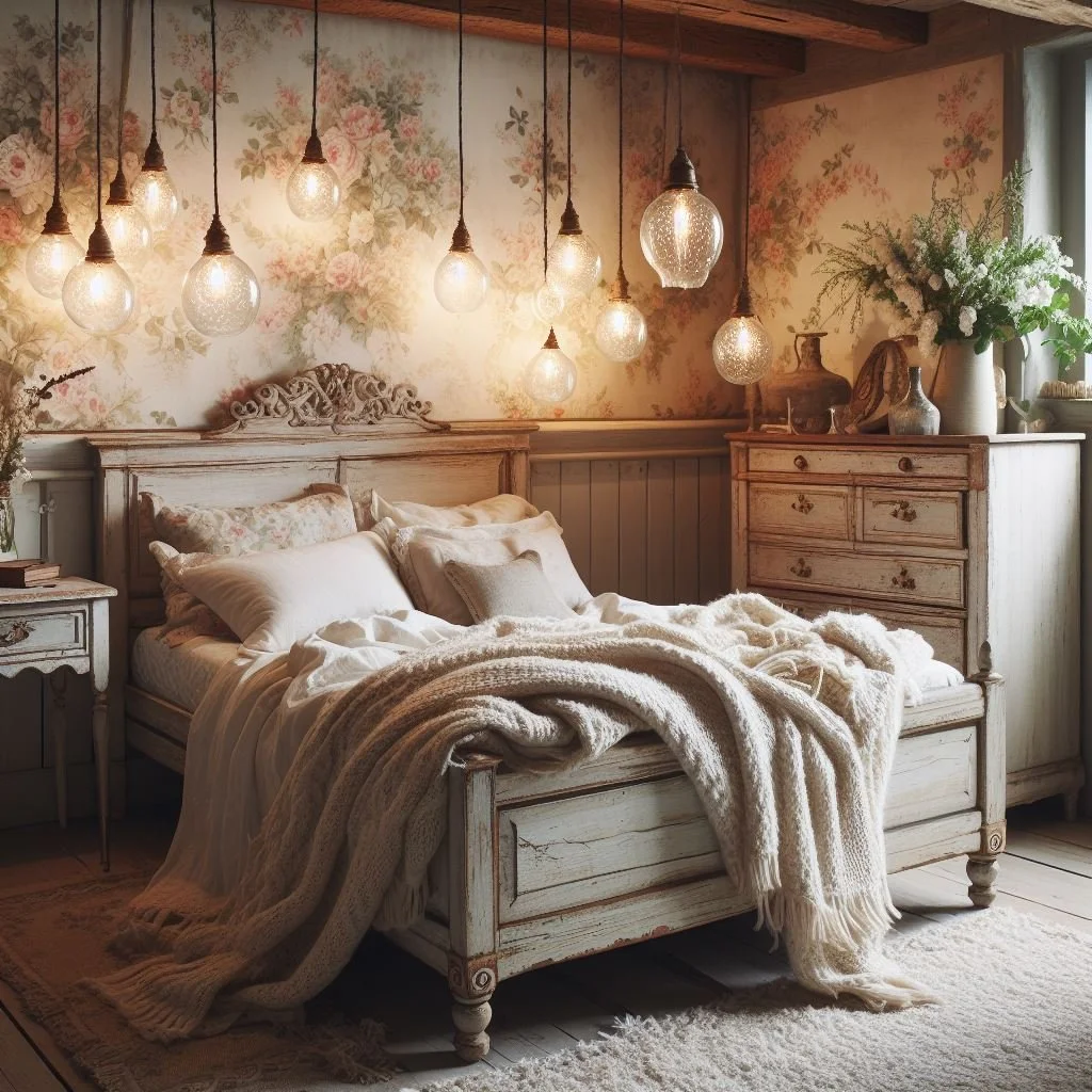 How can I add a cozy atmosphere to my shabby chic bedroom?