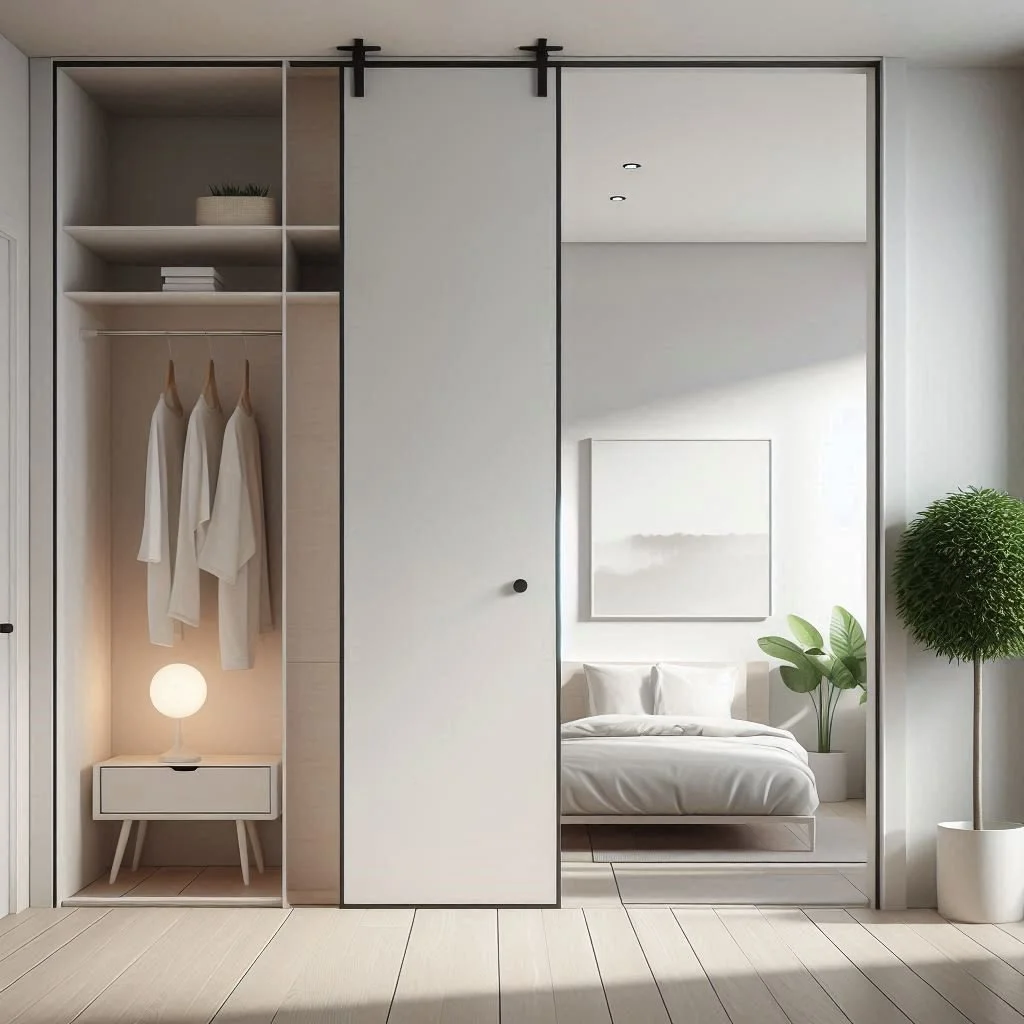 Sliding doors or curtains are a versatile solution for studio apartments, offering a stylish and practical way to partition your space. Use them to create separate zones, such as a private sleeping area or a dressing nook, without the permanence of walls. Sliding doors add a modern, sleek touch and can be frosted, mirrored, or transparent to suit your decor while maintaining a sense of openness. Curtains, on the other hand, provide flexibility and can easily be drawn back to open up the space when needed. Both options are ideal for adapting your layout to your daily needs, making the apartment feel more functional and personalized. Lightweight and easy to install, they also allow for creative design choices, like bold patterns or soft, flowing fabrics, enhancing your space with texture and style while maintaining a sense of flexibility.