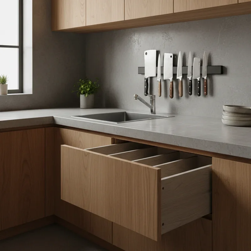 Cluttered drawers drive everyone crazy, especially in tiny kitchens where every drawer matters! Magnetic knife strips mounted on walls solve multiple problems simultaneously. They keep your knives safely stored, easily accessible, and prominently displayed like kitchen artwork. Unlike drawer storage, magnetic strips prevent blade dulling and reduce injury risks when rummaging through cluttered drawers. They work for more than just knives too. Attach metal measuring spoons, scissors, and other magnetic tools to maximize utility. Installation takes minutes with basic hardware, and the visual impact is immediate. Your knives become both functional tools and decorative elements, adding a professional chef vibe to your space. Plus, you'll reclaim entire drawer space for other essentials. It's a simple solution that delivers outsized benefits, proving that sometimes the best ideas are elegantly straightforward.