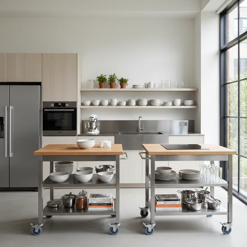 Studio kitchens rarely have room for traditional islands, but that doesn't mean you can't enjoy their benefits! Multi-purpose islands designed for small spaces pack incredible functionality into compact footprints. Look for models with storage shelves, drawers, towel racks, and even built-in trash bins or wine racks. Some feature drop-leaf extensions that expand when needed and fold away when space gets tight. The top provides precious prep space while underneath stores cookware, dishes, or small appliances. Wheels make them mobile, letting you reposition as needed or roll them completely out of the way. Some clever designs include flip-up breakfast bars or hidden cutting boards. Choose islands at counter height to extend your workspace seamlessly. They're investment pieces that earn their keep daily, offering storage, prep space, and sometimes seating all in one compact, movable package.