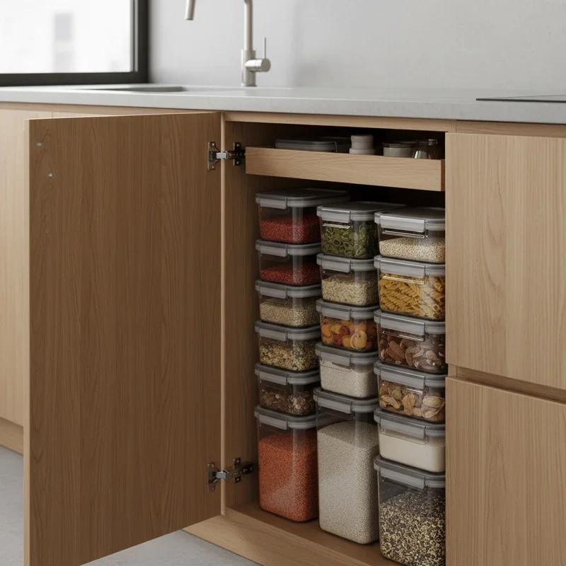 8. Stackable Containers Optimize Cabinet Space