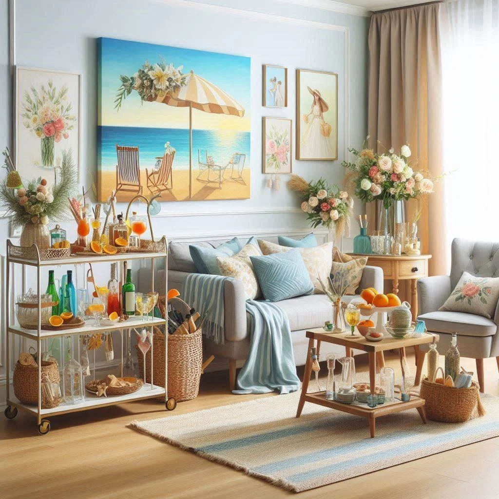 Nothing captures the essence of summer quite like a chilled drink on a warm day, and a well-stocked bar cart can make it even more enjoyable. Fill your cart with refreshing seasonal favorites like lemonade, sparkling water, and fun summer cocktails, ready to be served to guests or enjoyed on a leisurely afternoon. Add colorful glasses and playful stirrers to inject a pop of color, while a small vase of fresh flowers can add a natural, vibrant touch that ties everything together. This setup not only makes it easy to entertain but also doubles as a stylish decor piece, bringing both functionality and flair to your living space. A summer-themed bar cart invites relaxation and adds a touch of festive cheer to your home.