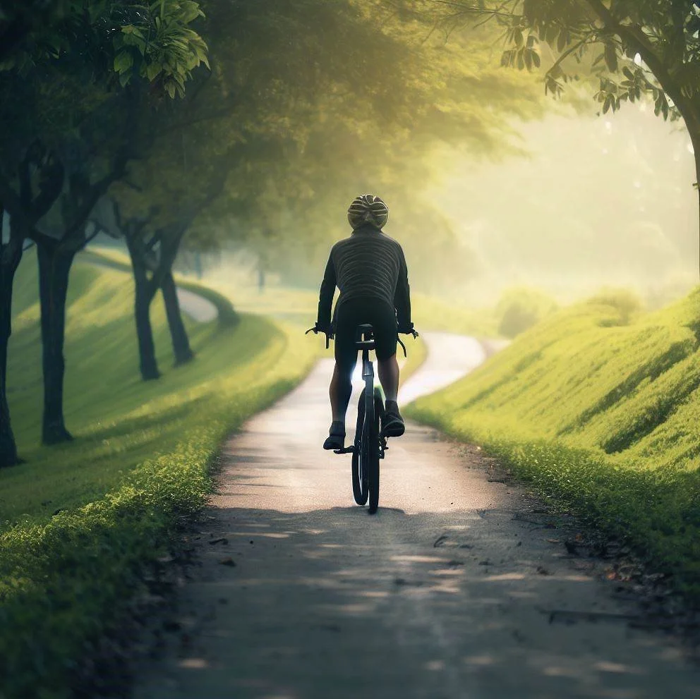 A cyclist riding a bike on a scenic green pathway, promoting sustainable transportation and the idea of navigating the roads responsibly.