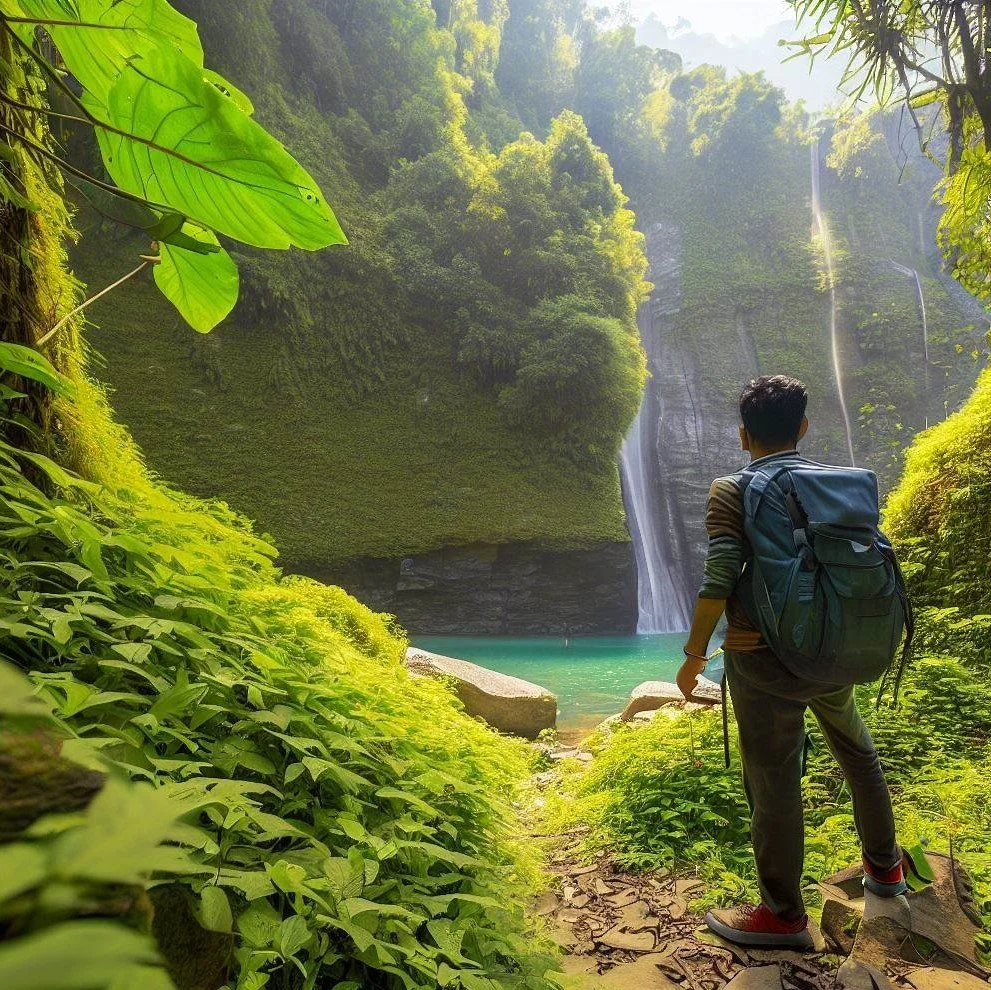 A person immersed in a sustainable travel destination, surrounded by nature and wildlife, promoting sustainable travel and the idea of exploring the world with care.