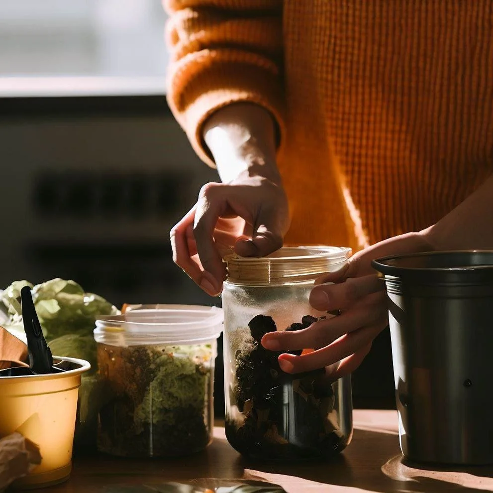 A person actively engaging in zero waste practices, using reusable containers and composting, representing the concept of embracing minimalism and resourcefulness.